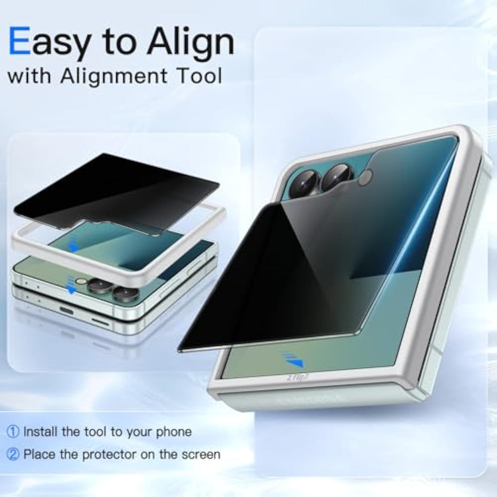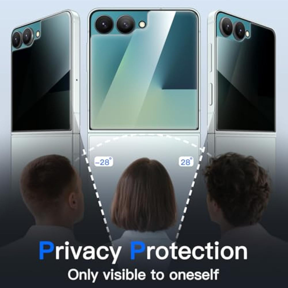 | [Compatibility] Designed for Samsung Galaxy Z Flip 7 2025 for great protection. NOTE: Not for Samsung Galaxy Z Flip 6 / Flip 5. The protector does not cover the entire screen to enhance compatibility with most phone cases | | [Privacy Protection] The screen is only visible to the person directly in front of it. Effectively protect your privacy from peeping | | [Effortless Installation] Comes with an easy installation tool. Allow you to align perfectly and install the front screen protector quickly without leaving any air bubbles | | [Premium Material] Built with 9H high hardness tempered glass. Highly protect the front screen from unwanted scratches and abrasions | | [Anti-Fingerprint] The hydrophobic and oleophobic coating effectively prevents the residue of fingerprints, oil and watermark from gathering on the screen | |