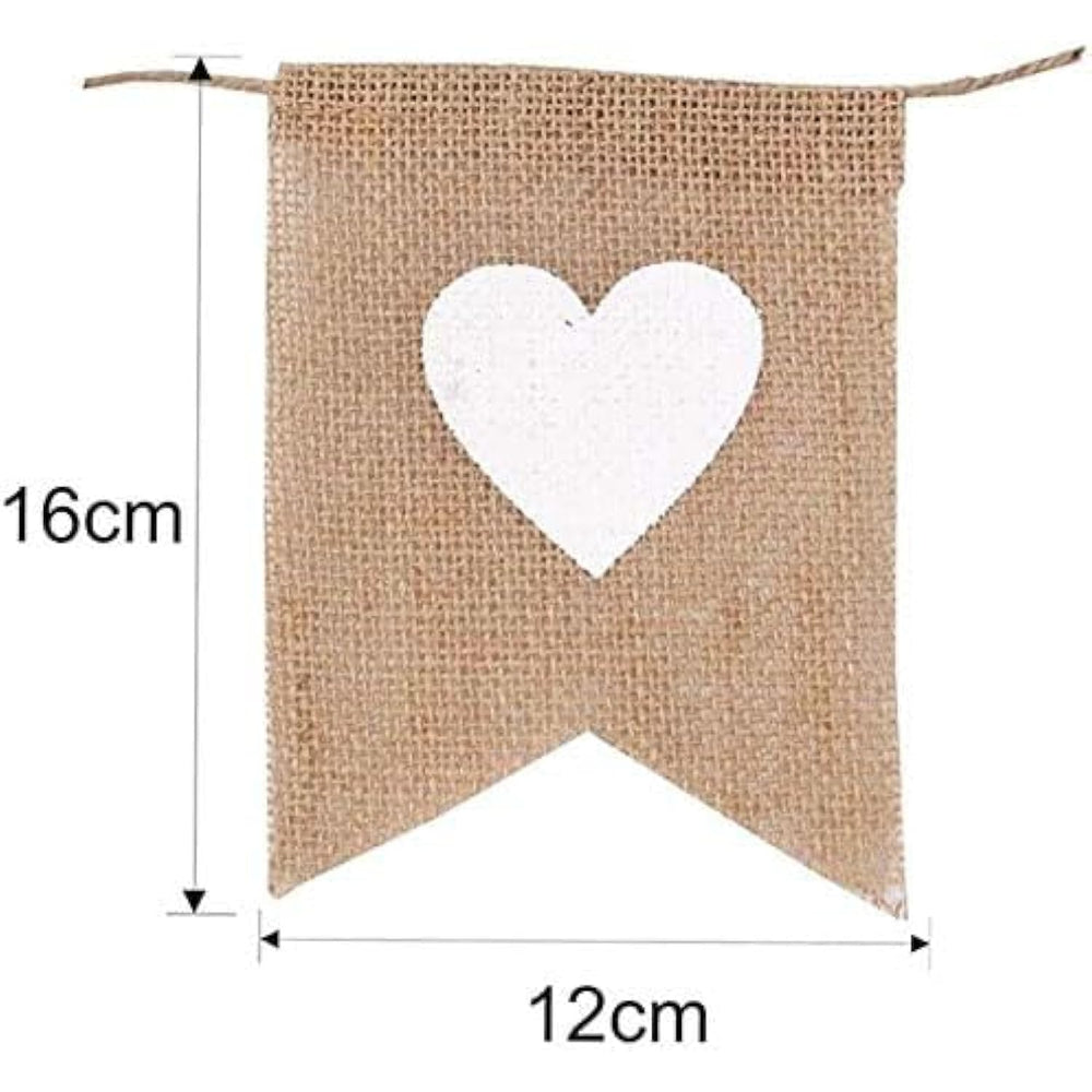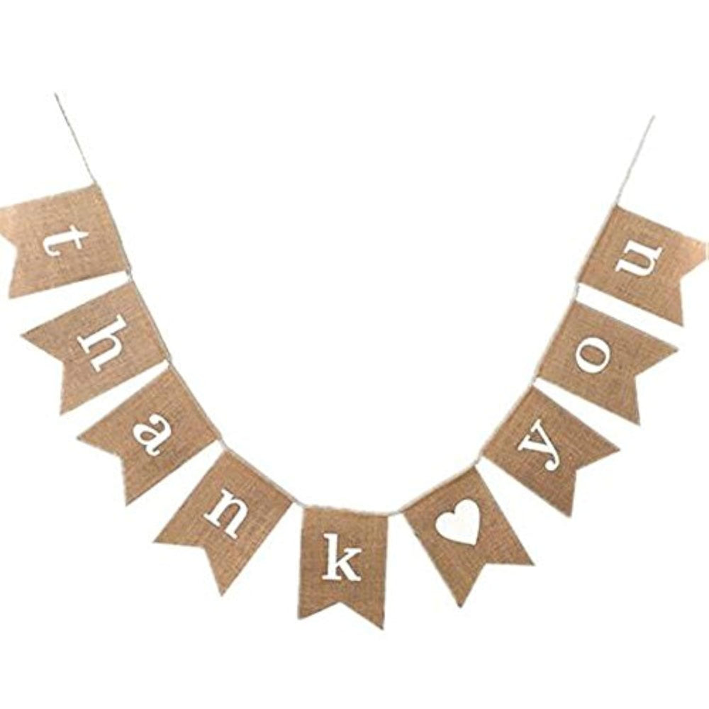 | Material :Natural Burlap | | Each Flag Size: Approx.12Cm*16Cm ,1 Bunting Including 9 Flags, Total 3.4M (Including The Twine To Hang) | | This Burlap Bunting Printed With "Thank You " On The Front Side,And A White Heart , Each Flag Is Has Locked Over The Edge | | Each Flag Is Not Fixed ,So It Can Adjust The Distance Between Each Flag | | Its Perfect For Wedding Party Decoration,Baby Shower Party Decoration, Christmas Party Decoration And So On | |