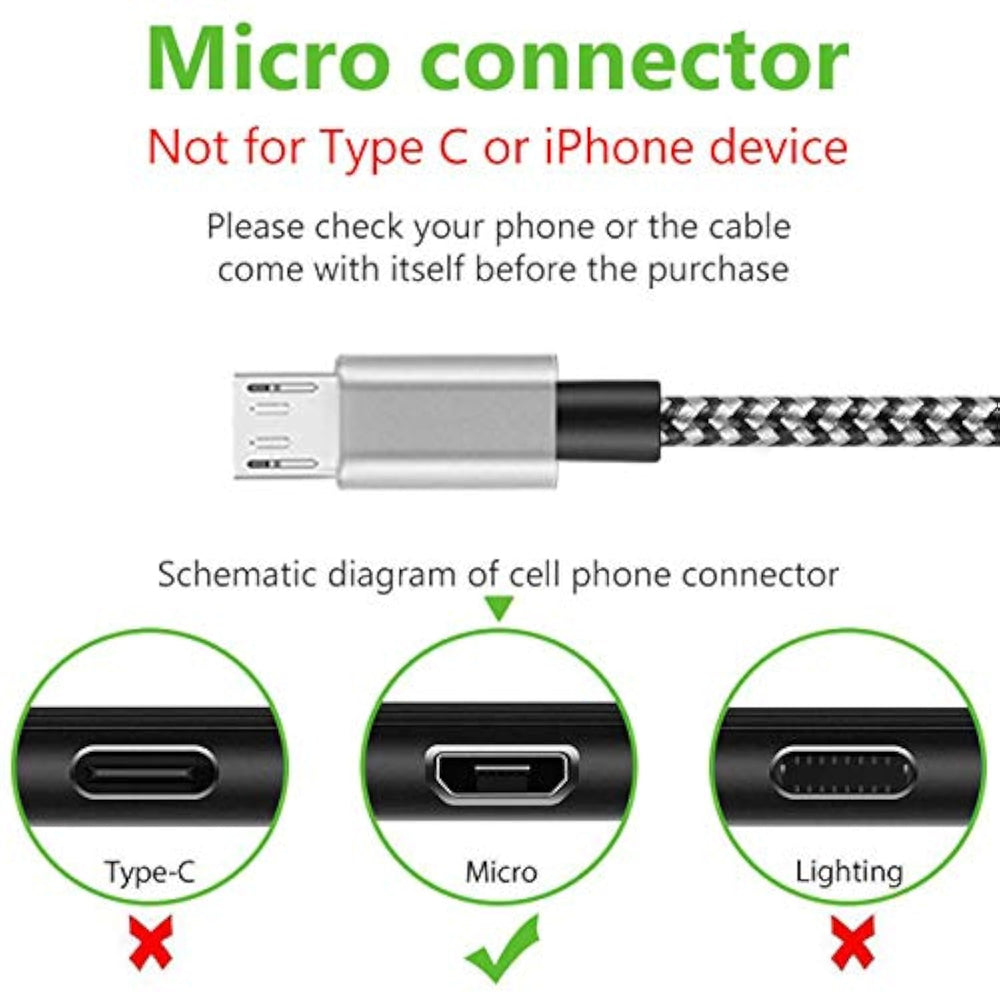 | This Is Micro-Usb Cable [An Asymmetrical Flat Plug Fit Most Android Device Before 2016 Released] And This Will Not Fit Type-C Device [A Bigger Symmetrical Oval Plug Fit Most Android Device After 2016 Released] | | Fast Charge And Data Transfer: High-Quality Tinned Copper Wire+ 3A Fast Charge, Fast Charge, Up To 30%. Usb 2.0 Cable - A Male To Micro B, Supports 480-Mbps Transmission Speed. | | Well Built: Sturdy And Tangle-Free Nylon Fabric Braided Usb Cable With Aluminum Connector Can Bear 4000+ Bending Test. Thicker Wire Allows For Faster Charging.. | | Compatible Most Android Phones: Samsung Galaxy S7, S7 Edge, S6, S6 Edge, S6 Edge Plus, S4, Tablet, Tab Pro 3/4 A S2, Grand Prime, Player, Note 4 5, A5 A7 A9, Htc One 10 M9 M9+ M8 M7 A9,Lg G4 G3 G2, Blu,Zte,Tcl,Huawei, Sony Xperia Motorola, Moto,And Other Android Device Cellphone. | | One Year :This Product Is Offered 12-Month .And We Offer Best And Quickly After-Sale Service. | |