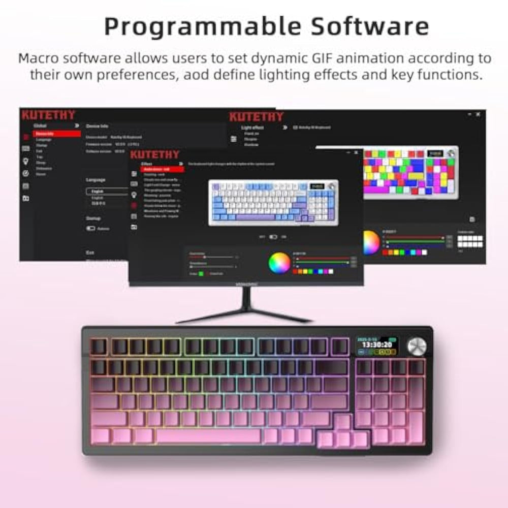 | [Multi-Functional Screen And Knob Design]: Kutethy Ky95 Wireless Mechanical Keyboard Is Equipped With A Display And A Multi-Functional Knob, Supporting Features Such As Custom Images, Time, And Battery Level Display. The Knob Allows Quick Adjustment Of Volume, Lighting Effects, Connection Modes, And More.Download Driver Customize Your Personalized Keyboard (Note:The Driver Is Officially Released By Kutethy And Will Not Cause Any Adverse Effects On Your Computer.) | | [Multi-Functional Triple Mode]:The Ky95 Mechanical Gaming Keyboard Supports Bt5.0, 2.4Ghz Wireless And Usb-C Wired Connectivity For Reliable And Lag-Free Performance. Suitable For A Variety Of Devices And Scenarios, It Is Easy To Switch Between Them With Just One Click.The Rgb Keyboard Comes With 16 Rgb Lighting Effects, More Than 16.8 Million Rgb Colors, And Front Lights To Add A Stronger Gaming Atmosphere. | | [Hot Swap Customized Keyboard]:Ky95 Mechanical Keyboard Wireless Equipped With Hot Swap Base, Compatible With 3-Pin Or 5-Pin Switches. No Soldering Process Is Required, Users Can Easily Replace The Switches To Customize Your Diy Keyboard! (Switch Puller Is Included In The Package). Equipped With Hot-Swappable Kailh Box Dark Chocolate Linear Switches, Pre-Lubricated Switches,For Smooth, Responsive And Noise-Free Typing, Suitable For Use In Quiet Environments | | [Mechanical Keyboard Structure]:Ky95 Pc Keyboard Features Padded Construction, Integrated Silicone Pads And Pcb Single Keyway For Enhanced Flexibility And Stability, Softer, And Reduced Noise; Non-Slip Feet And Adjustable Foot Support On The Bottom; Provides Stable And Comfortable Typing Sound And A Solid Feel | | [Pbt Keycaps And 4000Mah Battery]: High-Quality Side-Printed Gradient Color Pbt Keycaps, Abrasion-Resistant, Non-Fading, Anti-Sweat, And Softer To The Touch. 4000Mah Battery Provides Reliable Power Support, Ensuring Stable Use For A Long Time Without Worrying About Short Circuits. | |