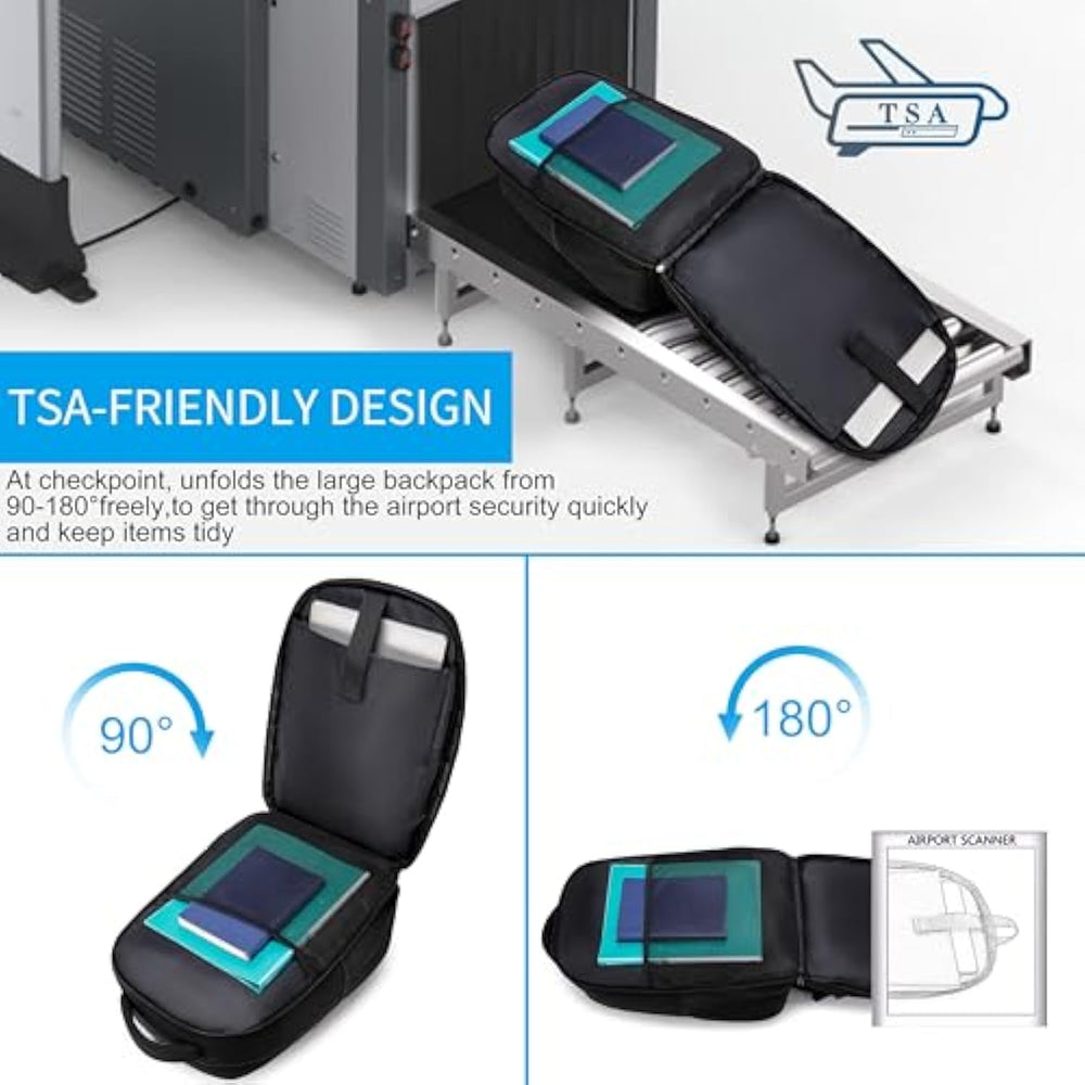 | Tsa Approved Backpack:Tsa Function Is Exclusively Designed For Airplane Flight Travel. At Checkpoint, Unfolds The Laptop Travel Backpack Freely 90 To 180 Degrees And The Laptop Stays Flat Without Taking It From The Bag, Making It Getting Through Airport Security Checkpoint More Easily. This 17 Inch Laptop Backpack Is Large And Lightweight Enough For School, Travel, Hiking, Vacation, Weekend Getaway, Overnight Trip | | Spacious Pocket: Bookbag Has A Separate Laptop Compartment For Notebook And Tablet (Size Up To 17.3 Inch). Main Pocket Roomy For Books, Clothes. Front Compartment Storage Tech Accessories. Side Mesh Pockets Hold Water Bottle Or Umbrellas. Back Anti Theft Pocket Protect Your Wallets, Passport. Multi Pockets Design Keeps Your Important Items Organized And Easier To Find | | Water Resistant And Multipurpose: 17.3 Inch Personal Item Travel Bag Is Well Made Of Waterproof Oxford Cloth With Metal Zippers. Padded Handle And Adjustable Shoulder Straps, Which Perfects For Business Traveling, Professional Office Work Bag And Other Outdoor Activities, College Backpack For Men Women. Recommended Age Range: 6 Years Old And Up | | Usb Charging Port And Luggage Sleeve: 17 Inch Sturdy Computer Backpack For Men With External Usb Charger Port And Built In Charging Cable Can Conveniently Charge Your Cell Phone, Tablet And Other Electronic Devices While Walking. Featuring The Trolley Belt On Its Breathable Back, Business Traveler Could Fit Large Backpack Right On The Luggage Suitcase, Which Free Your Hands | | Travel Gifts Idea: This Laptop Backpack Is The Great Gifts Choice For Students, Such As College Graduates. Work Gifts Designed For Adult Men Or Women As Thanksgiving Gifts, Christmas Gifts, New Year Gifts, Valentine'S Day Gifts Or Birthday Gifts. Special Holiday Gifts For Him Or Her, Your Husband, Wife, Son, Daughter, Father, Mother And Friends Coworker | |