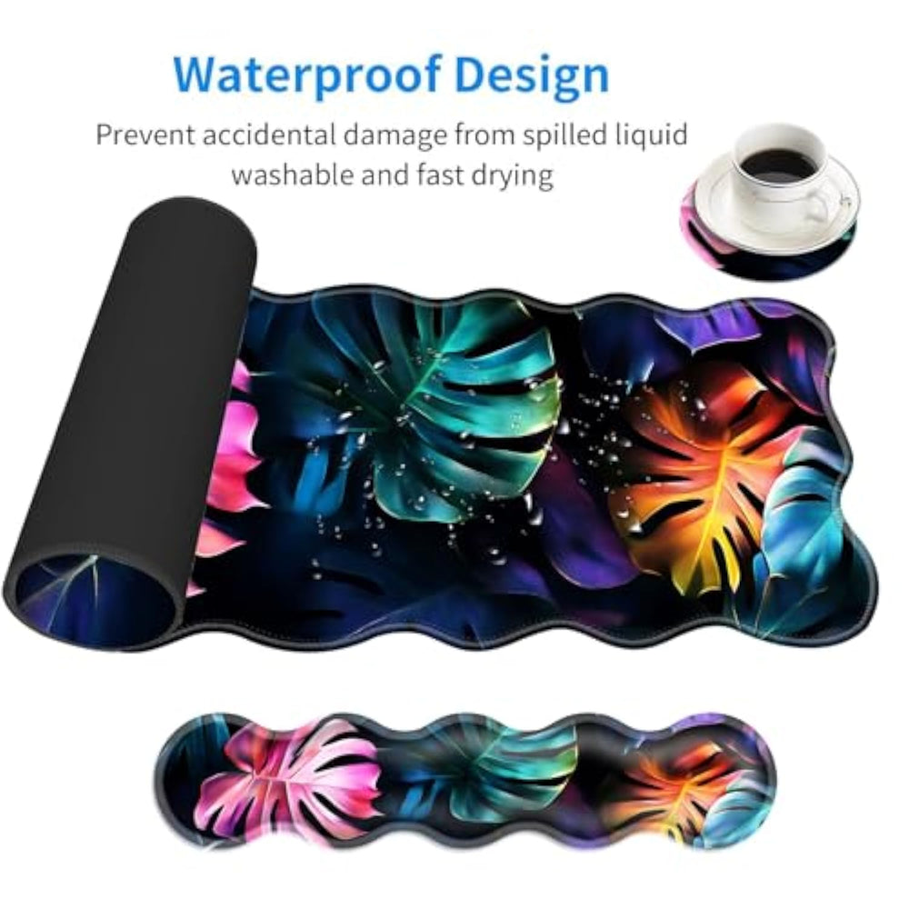 | ?4-In-1 Mouse Pad Set? Ergonomic Mouse Pad Includes Large Desk Pad(31.5×11.8 Inch), Keyboard Wrist Rest(17.32" X 3.5" X 0.98"), Mouse Wrist Rest(6.8" X 3.5" X 0.98"),Cup Coaster(3.9" X 3.9"). Extended Desk Pad Which Is Large Enough To Fit A Full-Sized Keyboard And Mouse, Providing Plenty Of Space For Gaming Or Office Work, And Keeping A Clean, Uncluttered Desk. | | ?Waterproof And Easy To Clean? Equipped With Waterproof Coating, Effectively Prevents Damage From Spilled Drinks Or Other Accidents. When Liquid Splashes On The Coating Surface, It Will Form Into Water Drops And Slide Down. Easy To Clean Without Delaying Your Work Or Game. | | ?Smooth Surface?The Smooth Fabric Allows You Ease Moving Your Mouse Easily And At The Same Time Precisely Locate It, And Give Your Hand A Comfortable Environment To Operate Your Mouse. Optimized For Fast Movement While Maintaining Excellent Speed And Control During Your Work Or Game. Compatible With Mechanical And Optical Mice. | | ? Stitched Edges?The Soft And Dense Nature Rubber Base Keeps This Extending Desk Mouse Pad Firmly In Place. Just Immerse Into Your Work Or Games Without Worrying About The Annoying Mouse Pad Movement. | | ?Ergonomic Design?This Mouse Pad With Wrist Support Set Designed With Memory Foam And Soft Smooth Material To The Pads, Lightweight Comfortable And Durable For Your Daily Work Life. | |