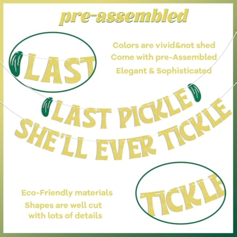 | ?? " Last Pickle She'Ll Ever Tickle " Banner - Pickle Wedding/Bridal Shower/Anniversary Party Decorations In Glitter Gold. | | ?Our Banner Made With Gold Premium Card Stock | | ??Letters Vary From 4 - 6 Inches Tall | | ??? Pre Strung - The Banner You Receive Is Already Strung On A String, No Need To Diy It Yourself, You Can Use It As Soon As You Receive It! | | ??Perfect For Last Pickle She'Ll Ever Tickle Bachelorette Party Decorations | |