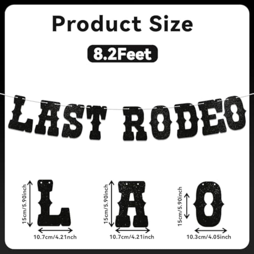 | Material: Eco-Friendly Paper, Surface-Attached Glitter, Perfect For A Western Bach Party. | | Black Glitter Last Rodeo Bunting Decorations, Western Bach Bridal Shower/Bachelorette Party Supplies, A Big Hit For Your Party. | | This Banner Is So Suitable For Your Cowgirl Bachlorette Party, Photo Studio, Etc. Perfect For Your Western Bachlorette Party Decorations. | | String It Yourself: The Banner Will Come With Letters That Have Pre-Cut Holes To String The Banner. | | Unique Design: Meticulously Hand Designed, We Made Sure Our Black Glitter Bachlorette Party Banners Were Super Premium And One-Of-A-Kind. Perfect For Your Rodeo Bachlorette Party And Will Set Your Bachelorette Celebration Apart Too! | |