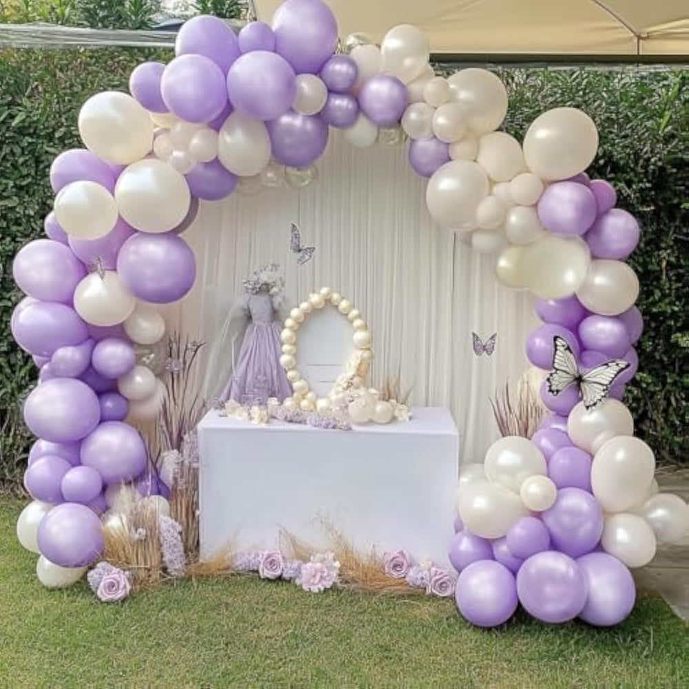 This double-stuffed pearl purple balloon kit includes 55 balloons in 18", 12", and 5" sizes, perfect for creating a stylish balloon arch. Crafted from high-quality, non-toxic natural latex, the balloons are durable and suitable for both air and helium. Easy to assemble, just inflate and insert into the pre-cut ribbon holes for a quick DIY setup. Ideal for baby showers, birthdays, weddings, gender reveals, and more, this kit adds a charming and festive touch to any celebration.