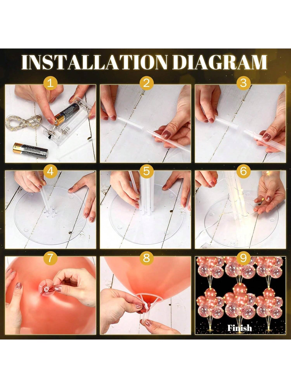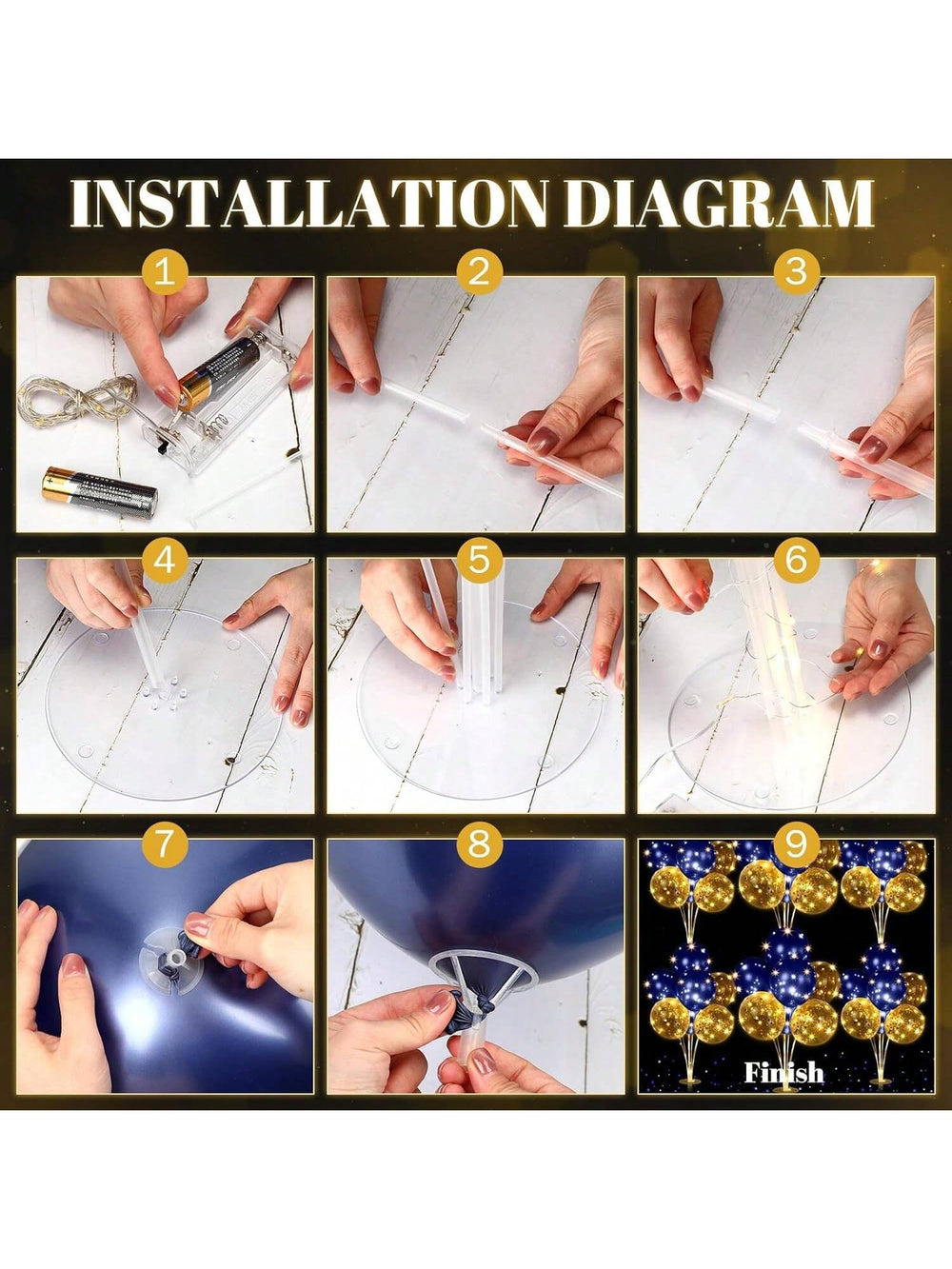 Easy to Assemble: connect the sticks of same length and thickness together with joints, insert them into the base, inflate the balloons and attach the knotted balloons to the cups, then put them to the heads of the balloon sticks, wrap the light strings around the balloons in the way you like; Put the thick sticks in the middle of the base; It is better to fix the light strings and base with dots