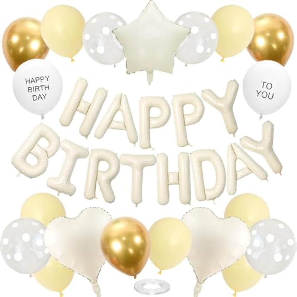 | Package Contents: You Will Receive 5Pcs 12-Inch Transparent Balloons With White Polka Dots, 7Pcs 10-Inch Macaron Yellow Balloons, 3Pcs 10-Inch Metallic Gold Balloons, 2Pcs 10-Inch White "Happy Birthday" Printed Balloons, 2Pcs 10-Inch White "To You" Printed Balloons, 2Pcs 18-Inch Cream Heart Foil Balloons, 1Pc 18-Inch Cream Star Foil Balloon, 1Pcs 16-Inch Cream "Happy Birthday" Foil Balloon,1 Pcs Ribbon And 1 Pcs Dot Sticker. Create A Dreamy And Sophisticated Birthday Atmosphere With This Thoughtfully Curated Set! | | Premium Quality:Our Foil Balloons Are Made From Non-Toxic Aluminum, Ensuring They Stay Vibrant And Last Throughout Your Event. Reusable And Easy To Deflate, They Can Be Stored For Future Celebrations. The Latex Balloons Are Crafted From Thick, Non-Toxic Material, Making Them Strong And Less Likely To Pop. Plus, They Are Biodegradable, Making Them An Eco-Friendly Choice For Any Celebration. | | Create A Memorable Celebration: Elevate Any Birthday With Our Elegant Cream-Colored Balloon Set, Designed With A Soft Ivory Base And Stylish Color Pairings To Suit Different Themes And Preferences. Perfect For Creating A Dreamy Backdrop, This Set Adds Warmth And Charm To Any Space, Making Your Special Day Truly Unforgettable. | | Occasions: Ideal For Milestone Birthdays, Family Gatherings, Or Lively Parties, This Versatile Balloon Set Blends Classic Elegance With Modern Style. Whether Decorating For A Home Celebration, An Outdoor Event, Or A Virtual Party, Its Refined Yet Festive Design Ensures A Picture-Perfect Setup For Any Occasion. | | Note:Due To Batch Variations, Slight Color Differences May Occur Between Balloons. Please Refer To The Actual Product Received. To Avoid Bursting, Do Not Overinflate The Balloons, Expose Them To Excessive Heat, Or Rub Them With Sharp Objects. | |