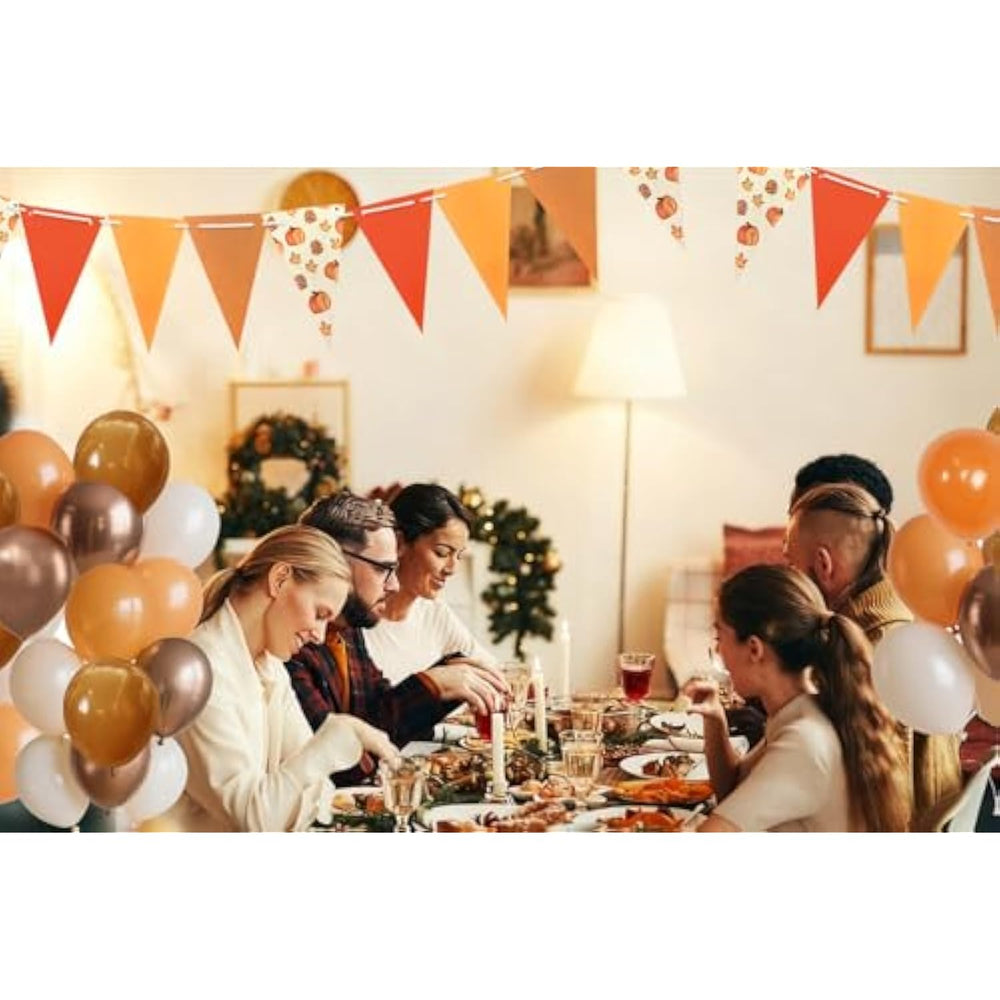 This fall party balloon and banner set includes 40 twelve-inch balloons in champagne gold, brown, orange, and ivory white, along with 2 strands of 9.8-foot fall-themed triangle pennant banners (24 flags total) and a roll of ribbon for easy assembly. Perfect for Thanksgiving, Friendsgiving, autumn birthdays, little pumpkin baby showers, fall bridal showers, and other seasonal celebrations, this kit instantly transforms any space with a warm, festive, and boho-inspired autumn vibe. The coordinated color palette and balloon size create an elegant and lively display, ideal for indoor decorations, party backdrops, or hanging accents.