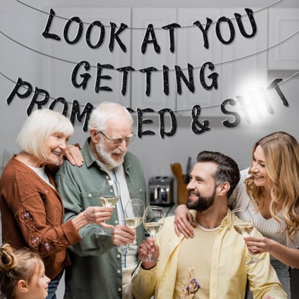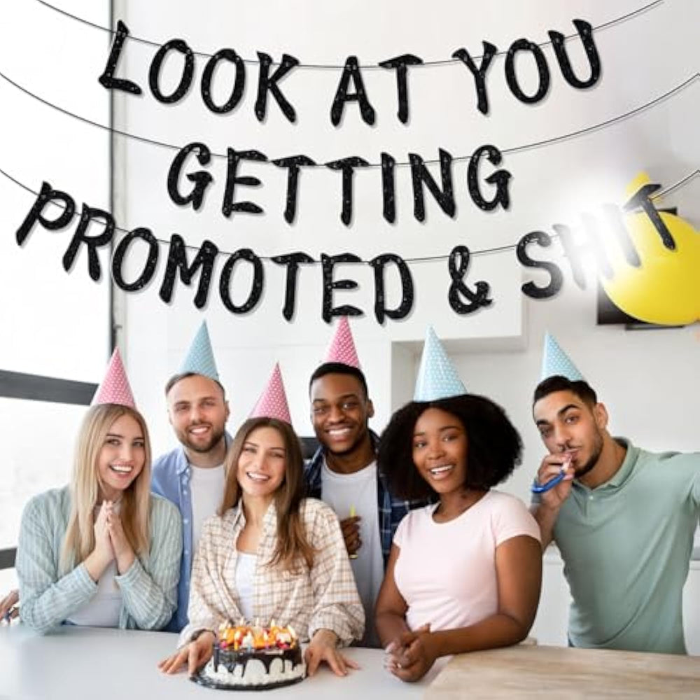 | ?Look At You Getting Promoted Banner?: Suitable For Celebrating Job Promotions And Career Advancement Milestones | | ?Premium Material?: Banner Made Of High Quality Glitter Paper, It Shines More Brightly In Light And Attracts People'S Attention. It Is Reusable And Easy To Save. | | ?Easy To Assemble?: The Letters And The String Are Separate, And You Need To String Them Together. First Thread The String Through The Plastic Needle, Then Through The Small Holes In The Letters, And Finally Adjust The Distance Between The Letters. | | ?Widely Application?: Ideal For Office Farewell Parties, Corporate Events, Promotion Celebrations, And Going Away Gatherings | | ?Service?: If You Have Any Questions Can Feel Free To