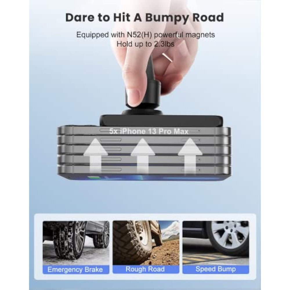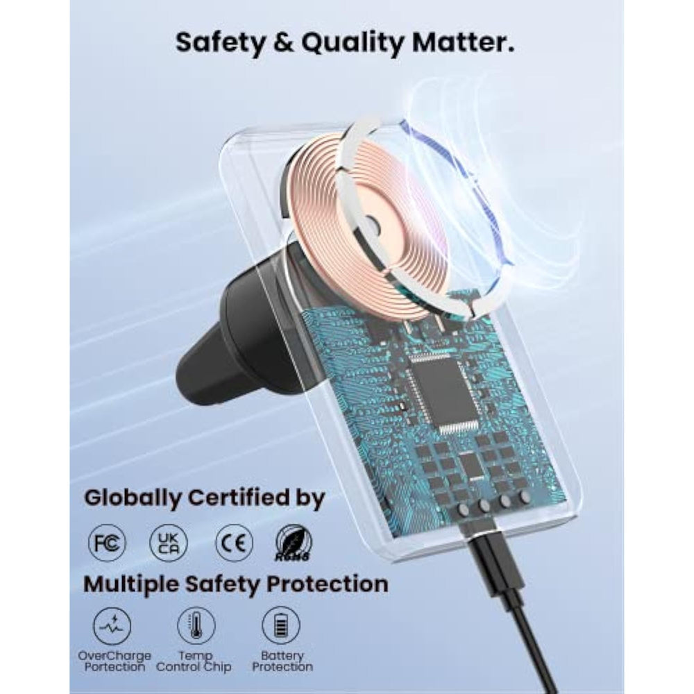 | Precise Seamless Magnetic Alignment For Efficient Charging: One Snap For Instant Charging! Featuring An Array Of Strong Magnets Around The Wireless Charging Coil, The Magnetic Car Charger Can Provide A Fast And Accurate Alignment For Your Iphone Every Time, Allowing For More Efficient Wireless Charging Experience (4.9Ft Charging Cable And 18W Car Adapter Included). | | Powerful Magnets To Hold Your Iphone Firmly In Place: Even If You Are Driving On A Rough, Bumpy Road Or Braking Sharply, The Wireless Magnetic Car Charger Can Always Securely Lock Your Iphone. It Can Hold Up To 2.3Lbs Due To The Built-In, Upgraded N52(H) Powerful Magnets. Even Better, This Magnetic Wireless Car Charger Will Keep Your Iphone Firm And Stable In Place As It’S Made Of Steel Core And Anti-Slip Silicone Shell. | | Multi-Protection For Safe Charging: Your Safety, We Care! With Advanced Multi-Protection Technology Like Overcharge Protection, Temperature Control, Overvoltage Protection, Short Circuit Protection And More, The Magnetic Cell Phone Charger Can Prevent Your Phone From Damaging Caused By Overheat, Ensuring A 100% Safe Charging All The Time. | | Only One Push For Simple Stable Installation: No More Complex Installation! Just Install This Wireless Car Charger In Seconds By Clipping It Horizontally Onto The Air Vent. Never Worry About The Magnetic Wireless Car Charger Mount Falling Off When Driving Your Car. | | Born For Iphone 14/13/12 Series: This Magnetic Car Wireless Charger Can Work Flawlessly With Almost All Cars, And It’S Only Compatible With Iphone 14/14 Pro/14 Plus/14 Pro Max/13/ 13 Pro/ 13 Pro Max/ 13 Mini/ Iphone 12/ 12 Pro/ 12 Pro Max/ 12 Mini (Note: This Magnetic Cell Phone Charger Can Juice Up Your Iphone Without A Case Or With An Original Mag Safe Case). | | 360° Fully Adjustable Viewing, Vertical Or Horizontal Charging: Charge Your Phone In Portrait Or Landscape With The Mag Safe Car Mount Charger As You Like! Thanks To 360° Rotatable Design, The Wireless Car Charger Mount Supports Both Vertical Charging And Horizontal Charging For A Perfect Viewing Angle, Making It Ideal For Easier Navigation Or Watching Videos During Your Trip. | |