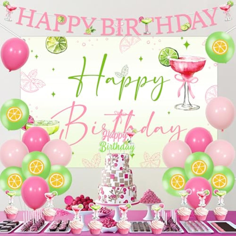 | Package Includes:1 Pink And Green Margarita Birthday Backdrop, 1 Margarita Happy Birthday Banner, 1 Margarita Birthday Cake Topper, 12 Margarita Cupcake Toppers, 18 Latex Balloons 12β, 2 Ribbons. | | High Quality Materials: The Margarita Birthday Backdrop Is Made Of High-Strength, Sturdy, And Wear-Resistant Vinyl Fabric.Margarita Birthday Banner Is Made Of Thick Cardstock, Sturdy, And Balloons Are Made Of Latex Materials, All Are High-Quality And Textured Materials! | | Colorful Design: We Used A Combination Of Bright Green, Pink, And Rose Colored Balloons. And The Margarita Birthday Banner Is Designed In Green And Pink Tones, With Patterns Of Cocktails, Wine Bottles, And Lemon Slices Printed, And A Large "Happy Birthday" In The Middle. The Design Of The Entire Set Is Very Colorful And Distinctive In Style. | | Easy To Assemble: The Backdrop Can Be Hung On Walls, Windows, Or Anywhere. Balloons Can Be Placed Next To The Backdrop Or Anywhere Else, You Can Freely Use These Things To Decorate Your Birthday Party. | | Wide Application: Margs And Matrimony Decor Is Suitable For Margarita Birthday Party,Bridal Shower, Mexican Bachelorette Party, Fiesta Bridal Shower, Cactus Party, Engagement, Wedding, Etc. | |