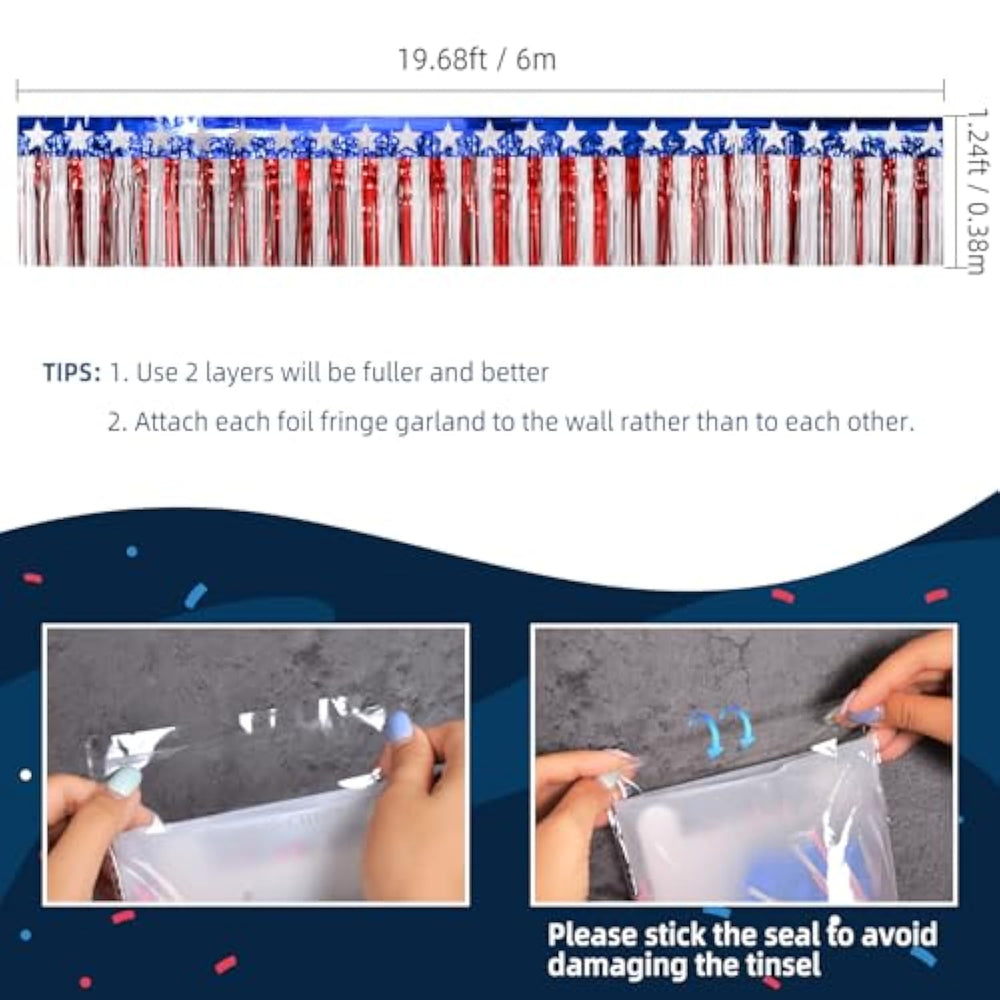 | Aluminum Foil | | ?? Package Includes: 2 Packs Red White And Blue Star Foil Fringe Garland / Metallic Tassel Banner, Each Garland Is 1.24 Feet Wide * 19.68 Feet Long, Perfect 4Th Of July Decorations. | | ?? Easy To Install: Metallic Foil Fringe Garland Has Double Stick Tape At The Back For Easy Mounting And Removal. It Can Be Easily Cut Into Any Size As Well. | | ???? High-Quality Function: High-Quality Metal Foil Tassel Garland, Lightweight, Easy To Use, Bright Color, Can Create A Strong Festive And Fun Atmosphere. | | ?? Applicable Occasions: Suitable For All Kinds Of Activities, Such As Parade Floats, Table Skirts, Weddings, Carnivals, Graduation Parties, Classroom Decorations, Stage Skirting, Christmas, Halloween, Dance, Photography Background, Etc. | | ?? Festive And Fun: These 4Th Of July Foil Streamers Are The Finishing Touch For Any Themed Party Such As Memorial Day Party, Us Flag Day, Independence Day Party, Veterans Day Party, Election Party, Labor Day Party, Or Wedding Party Decorations. | |