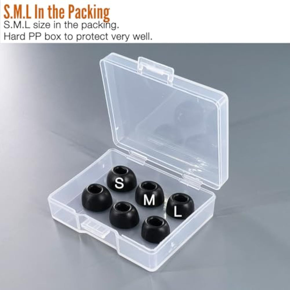 | Special Design With Ellipse Shape. Perfect Match The Earbuds. | | Super Comfort: Ultra Soft Memory Foam Tips. No Pain, No Press Or Other Discomfort. Conform To The Shape Of The Ear Canal At Your Body Temperature For A Dynamic Custom Fit. | | Strong And Durable: Break Strength Is Over 10Kg/22Lbs. Rebound Time Is Over 60 Seconds Which Is Much Better Than 99% Market Normal Foam (Rebound Time Less 3 Seconds ). | | Easy Insatllment: No Tools Needed, Two Steps Installation, Only Seconds You Will Have A New Earbuds. | | Packing List: 3 Pairs/ Pack With S.M.L Size. 1 Pair For Each Size. | |