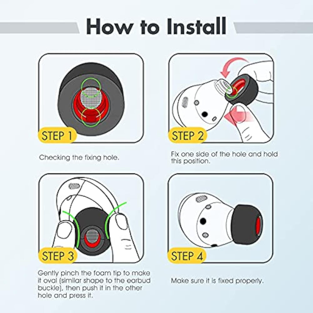 | ?Long Lasting Comfort?High Quality Soft Foam Can Provide 24 Hours Comfort And Stop The Ear Hurting Pain Caused By Silicone Tips. You Can Choose The Perfect Size Which Comply To Your Individual Ear Shape. | | ?Anti-Slip Foam?It Is Great To Wear For Many Hours And No Slipping. You Will Feel Comfortable And Free When Exercise Or Working. The Foam Ear Tips Won’T Easily Fall Out If You Choose Right Size. | | ?Special For Galaxy Buds Pro/Plus?Better Sweat Resistance And Durability. Simple Installation And It Fits Galaxy Buds Pro Perfectly. No Need To Remove The Foam When You Put Your Earbuds Pro In The Charging Case. | | ?Slow Rebound Sponge?Memory Foam Is A Polyurethane Foam With Slow Rebound Sponge. It Will Be Ugly And Deformed After Pressing, Usually It Needs To Wait 5-8 Minutes To Fully Rebound. Don’T Worry. | | ?Improved Sound Quality?This Galaxy Buds Pro Memory Foam Tips Can Offer A Good Seal To Reduce Some Of The Outside Noise And Allow You To Focus On Your Audio. | |