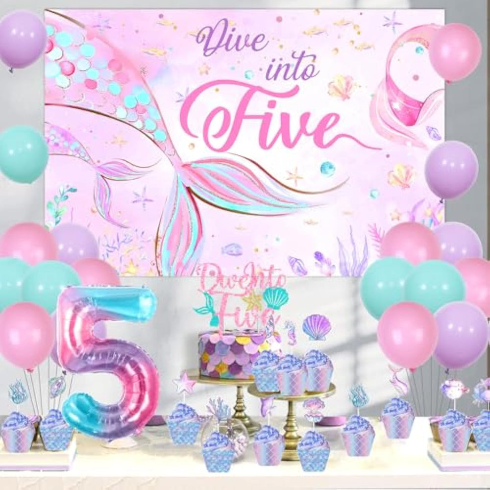 | Package Includes: You Will Get 1 X Dive Into Five Backdrop, 1 X Number 5 Foil Balloon 40 Inches (Helium Supported), 12 X Latex Balloons 12 Inches(4 Pink, 4 Blue, 4 Purple), 1 X Glitter Dive Into Five Cake Topper, 12 X Mermaid Cupcake Toppers, Which Can Meet All Your Mermaid Dive Into Five Birthday Party Decorations | | Mermaid Theme Design: The Dive Into Five Birthday Decoration Is Specially Designed For Girl Five Years Old Birthday Party, Which Designed With Mermaid Theme Elements, Such As Mermaid Tail, Starfish And Shell, Vivid And Adorable, Match The Theme Well | | Glitter Cake Toppers: The Mermaid Cake Toppers Are Made Of High Quality Glitter Cardstock, Which Can Shine Under Sunshine And Light, Beautiful And Exquisite; The Cake Topper Can Make Your Cupcake More Attractive And Bring The Fun To Your Party; You Can Also Apply Them For Ice Cream, Fruits, Cookies And Other Desserts | | Dive Into Five Backdrop: The 3 X 5 Ft Backdrop Is Made Of Quality Polyester Fibre, Which Is Durable, Reliable And Can Be Use For A Long Term; The Backdrop Deigned With Mermaid Pattern And Printed With Dive Into Five Words, Which Is Consistent With The Mermaid Them Well | | Wide Application: The Mermaid Dive Into Five Birthday Decoration Is Suitable For Girl 5Year Old Party, Ocean Theme Party, Under The Sea Them Party And Can Be Also Applied For Girl Room Decoration, Home Decoration | |