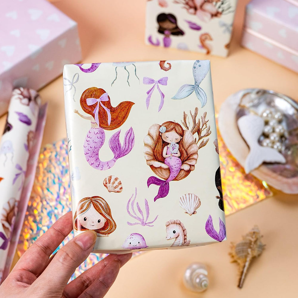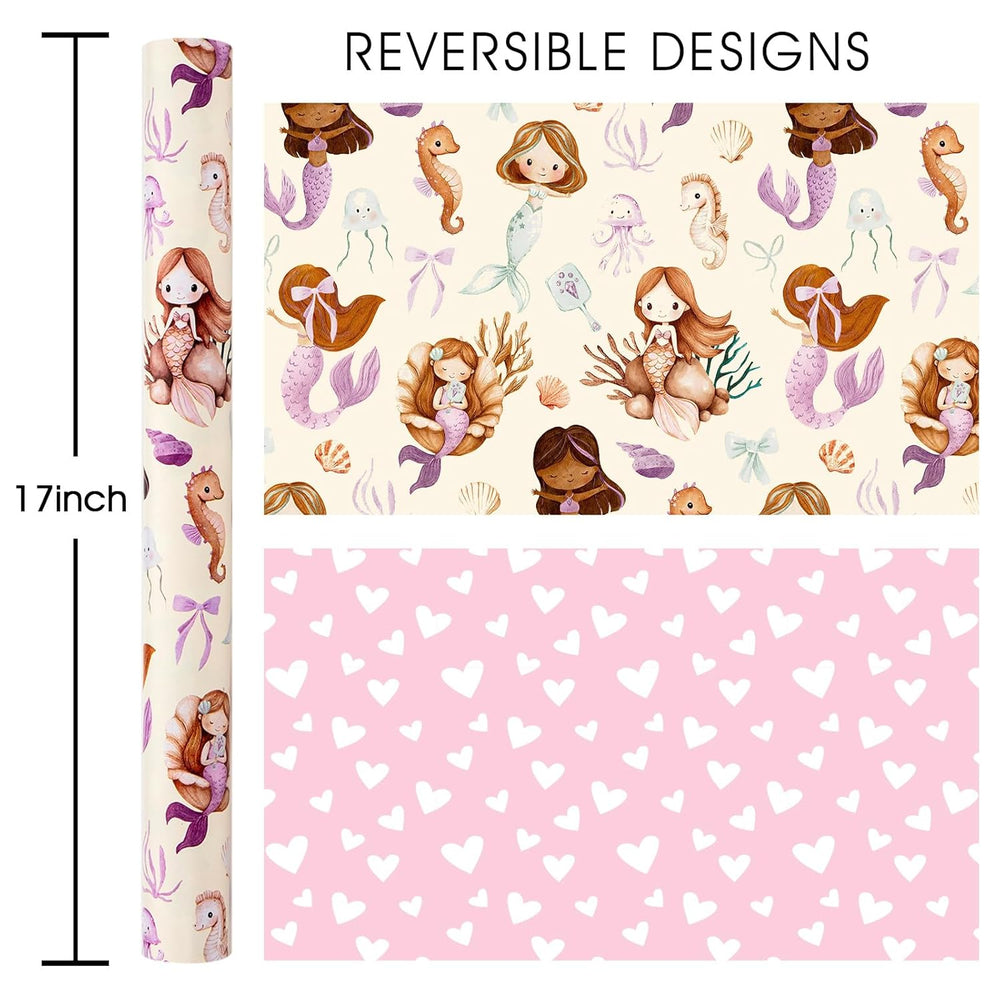 | ?Mini Roll?The Cute Mermaid Wrapping Paper Roll Measures 17 Inches In Width And 16.5 Feet In Length, Providing A Total Of 23.4 Square Feet Of Wrapping Paper. Please Note That The Roll Is Not A Standard Width; It Is Narrower Than Usual, Making It Easy To Store And Suitable For Small Or Medium Gifts. Please Confirm The Size Of Your Gifts Before Ordering To Ensure A Perfect Fit. ?Reversible Mermaid Wrapping Paper?This Vibrant Gift Wrap Paper Features A Charming Dual-Sided Design. One Side Showcases A Delightful Ocean-Themed Print With Jellyfish, Bow, Seahorses And Shell, While The Other Side Presents A Heart Pattern On Pink. With Two Design Options, It Offers Endless Creativity And Versatility For Gift Wrapping. ?Cute Girl Birthday Gift Wrap?This Mermaid Gift Wrapping Paper Is Perfect For Celebrating Girl'S Birthdays, Baby Showers, Or Parties. The Warm Design Adds A Playful And Polished Touch To Your Gifts. Elevate The Presentation Of Your Gifts And Spread Smiles On Any Special Occasion. ?High Quality Material?This Wrapping Paper Crafted With Durable And Tear-Resistant Paper, Which Is Easy To Handle And Delivers A Crisp Fold Every Time. The Print Is Vivid And Clear, Ensuring A Premium Appearance On Every Gift. ?Packing?The Gift Wrapping Paper Is Covered With Shrink Film, Protecting It From Scratches And Dust And Ensuring Its Vibrant Appearance Remains Perfect For All Your Creative Projects. It Is Not Folded And Has No Creases. If You Have Any Questions About Our Wrapping Paper Roll, Please Don’T Hesitate To
