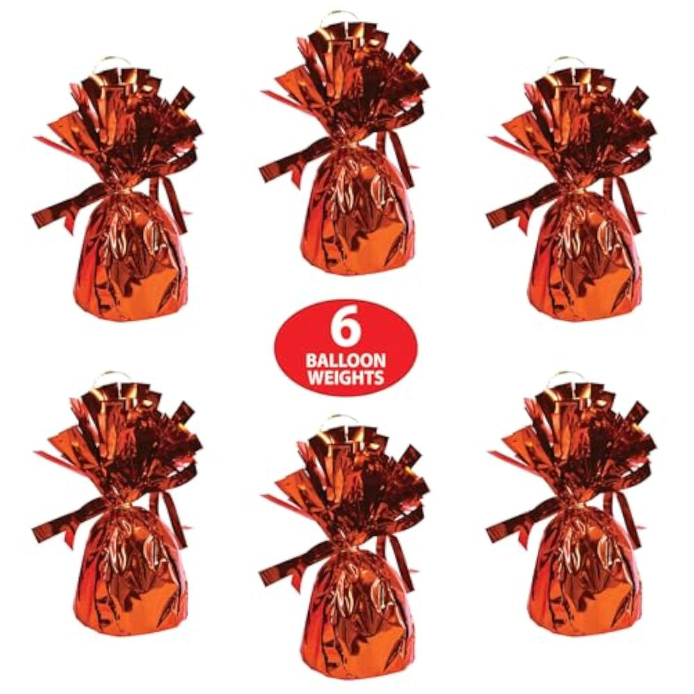 This set includes six durable 6-ounce balloon weights with a vibrant orange metallic finish and built-in ribbon loops for easy attachment, keeping helium balloons securely in place while adding a fun and festive touch to birthdays, Halloween parties, Thanksgiving, fall celebrations, graduations, sports events, and other seasonal or themed gatherings.