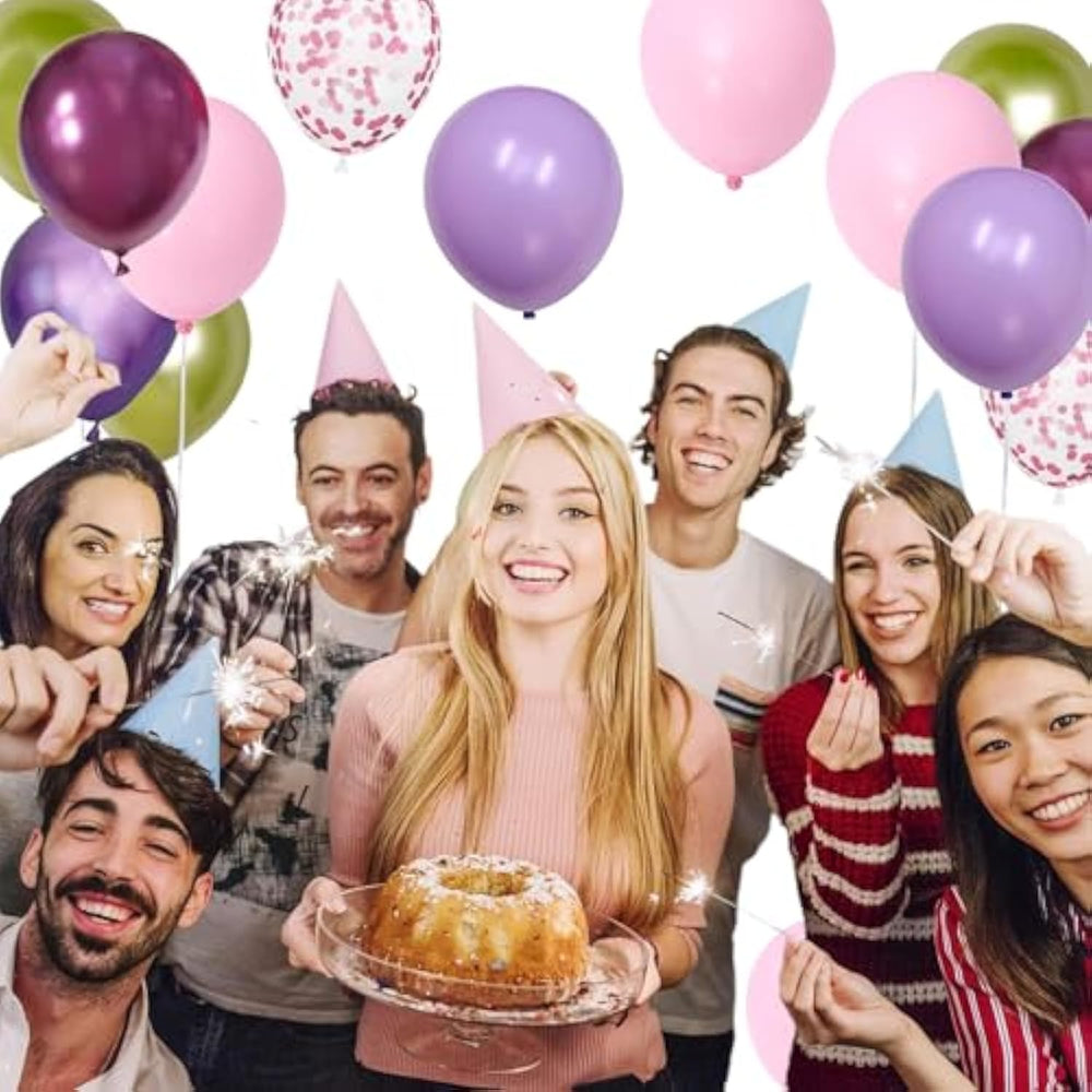 This vibrant party decoration set features hot pink, green, and purple balloons, perfect for birthdays, Hawaiian-themed parties, baby showers, bachelorette parties, bridal showers, weddings, and anniversaries. The set includes six colors of latex balloons—metallic purple, metallic pink, pink, purple, green, and confetti balloons—offering a fun and festive mix. Ideal for multiple uses, you can hang them from ceilings, create wall or background décor, or craft DIY balloon art to elevate any celebration. For safe and easy inflation, use a pump rather than inflating by mouth; the balloons can also be filled with helium for floating decorations.