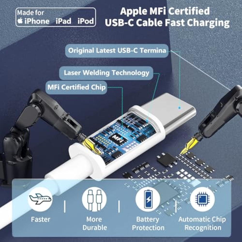 ?20W Usb-C Power Iphone 15 Charger Fast Charging?: 'S 20W Usb-C Pd Fast Charger Is Perfect For Iphone 15 Series, Delivers 20W Power Output And Offers Full-Speed Charging To Iphone 15. The Latest Power Delivery Charging Technology Smart Chip Work In Tandem To Lower Power Consumption, Maximize Charging Efficiency To Over 99%. Provides A Much More Faster Charging Speed For Your Iphone 15: Gets To 60% Charge In 25 Minutes, Which Means It Only Takes 50 Mins To Charge Your Iphone 15 Fully. | | ?3Pack Mfi Certified E-Marker 6Ft Type-C To Type-C Cable?: Adopt Original Usb-C Terminal And 56? Pull-Up Resistor Adjust Voltage Current Output To Match Connected Iphone 15/Ipad Pro, Embedded E-Marker Smart Chipset Provide Overvoltage Protection, Battery Protector And Automatic Chip Recognition Functions, Preventing Your Iphone From Overvoltage And Overcurrent. In Addition, The Mfi Certified Cable Comes With Surge Protection And Other Advanced Safety Features Maximize Charging E.
