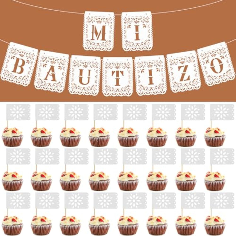 | Mi Bautizo Decorations Kit: You Will Get 1 Set Of White Papel Picado Banner Into 2 Strings And 24 Cake Toppers, Ideal For Adding A Festive Spanish Touch To Your Baptism Party | | Suitable Size: Each Letter Banner Measures 4.72 X 5.91 Inches, Each Cake Toppers Measures 2.5 X 1.7 Inches, And The Wooden Stick Is 3.94 Inches, The Combination Of Banner And Cake Topper Meets Most Christening Party Needs | | Materials: The Mi Bautizo Decorations Is Made Of Paper Materials, After The Event, You Can Store It And Use It For Other Parties Such As Mexican Themed Parties, Weddings, Birthdays, Día De Los Muertos, And Cultural Celebrations | | Easy To Use: There Are Holes On Each Side Of The Mi Bautizo Banner And It Comes With Corresponding Ropes, So You Can Easily Hang It Up; In Addition, The Small Stick Flags Are Pre-Pasted And You Can Use It Directly | | Occasions: This Baptism Party Decorations Kit Is Ideal For Baptism Theme Parties, Baby Shower Theme Parties, Birthday Parties, God Bless Theme Religious Parties, First Holy Communion And So On, Adding Real Charm To Your Special Events | |