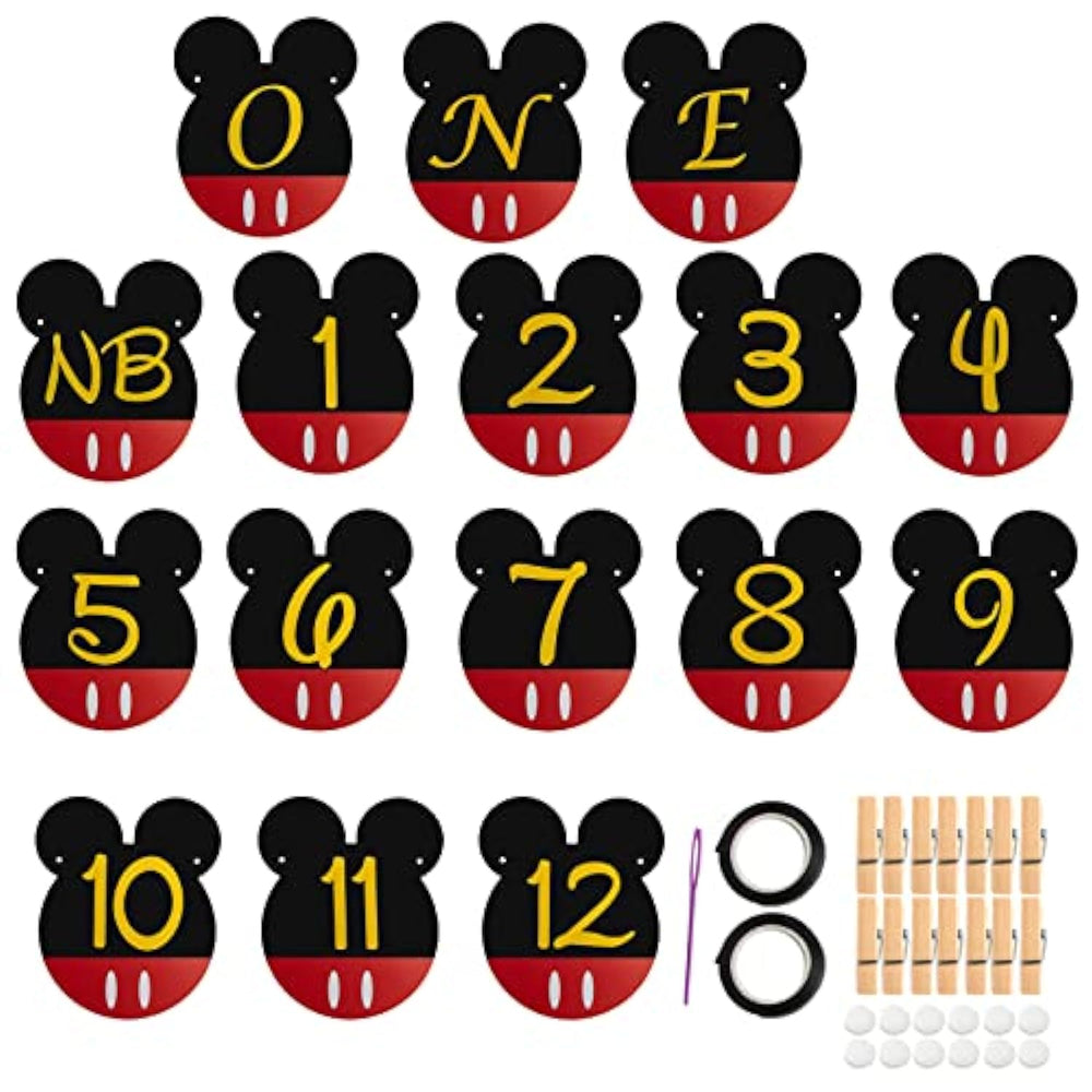 | Monthly Photo Banners: Includes 13 Nb To 12 Month Photo Cards And 3 High Chair Banner Cards | | Adhesive Backing: Comes With 15 Wooden Clips And Double-Sided Adhesive For Easy Hanging | | Durable Materials: Made From Sturdy Cardboard With Black Color Scheme | | Mickey Themed: Perfect For A Child'S First Birthday Party With Mickey Mouse Theme | | Decorative Wall Hanging: Can Be Hung On Walls, Doors, Or Tables For A Festive Celebration | |