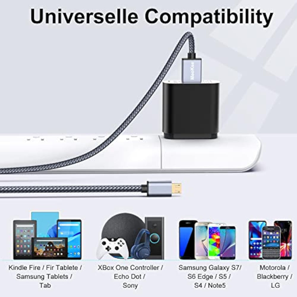 | Quick Charging Sync: 26Awg Usb A Male To Micro Usb Cable Enables The Cable To Provide The Fastest Possible Charging Speed. Enjoy Charge Times Up To 7% Faster Than Most Standard Cables And 480Mbps Data Transfer (Under Usb2.0 High Speed Mode)Via Backwards Compatible Usb 2.0. [Please Note: To Charge Your Device Faster, Strongly Recommend To Use The Qc 2.0 Adapter As Its Power Source If Your Device Support Qc 2.0/3.0.] *Not Compatible With Iphone Or Type-C! | | Braided Micro Cable: High Quality Stylish And Durable Nylon Braided Cable Protects The Core For Long Life, Provides Greater Durability And Greater Flexibility, Is Tangle-Free, Non-Toxic, Harmless, Convenient, Lightweight And Easy To Coil. Tested For 10000+ Flex Life, Tightly Woven Cord For A Flexible And Comfortable Feel. Micro Usb Cords Is Many Times More Durable Than Thing Else On The Market. Usb 2.0 Cable - A Male To Micro B; Supports 480-Mbps Transmission Speed. | | Sturdy Perfect Fit:This Micro Usb Cable More Strong And Durable; Compact And Heat-Resistant Aluminium Connector Fit Snugly And Secure A Good Connection; These Micro Usb Cables Will Connect Your Devices Better And Won'T Easily Fall Out Of Your Devices Like Other Cables Do | | Convenient Length: At 20 Feet, This Cable Is Long Enough To Easily Charge Your Devices In The Bedroom, Sofa, Office, Even When You'Re Sitting In The Back Seat Of Your Car. The Perfect Replacement For The Original Usb Cable With Great Performance. | | After Sale? If It Comes Defective Or Damaged, Please Feel Free To