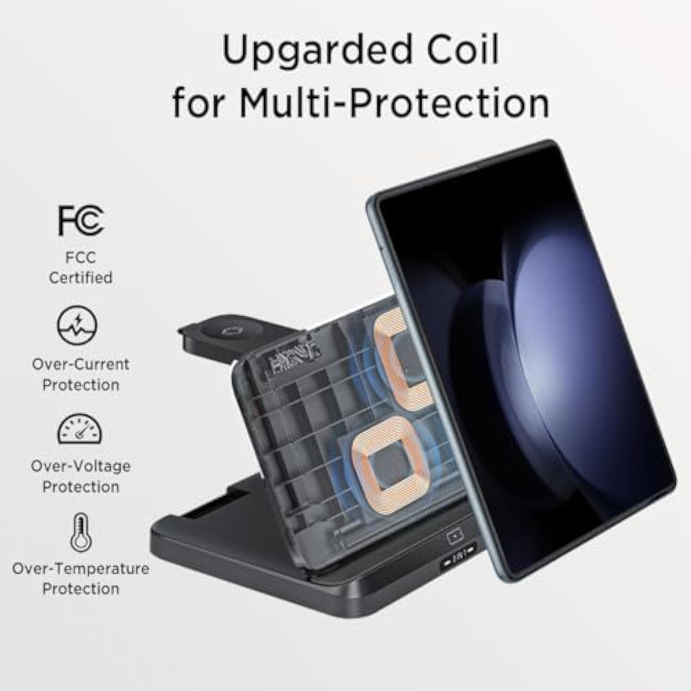 [Wide Compatibility] For Galaxy Z Fold/Z Flip Series, Samsung Galaxy S24 Ultra/S24+/S24/S23 Ultra/S23+/S23/S23Fe/S22/S22 Ultra/S21/S21+/S21 Ultra/S20/S20+/S20 Ultra, For Galaxy Watch Series (Galaxy Watch 6/Watch 6 Classic/Watch 5/Watch 5 Pro/Watch 4/4 Classic/Galaxy Watch 3/3 Lte/Galaxy Active 2 Lte/2/1), For Galaxy Buds Series (Galaxy Buds 2 Pro/2/Live), For Iphone Series (Iphone 15/14 Pro Max/13 Pro/12/11/Xr/Xs/X/8 Plus). Note: Not For Apple Watch, Galaxy Watch Gear, Sport, Fit, Live Series. | | [Highly Efficient Qc 3.0 Fast Charging] Our Galaxy Z Fold 6 Wireless Charging Station Provides 18W Qc 3.0 Adapter And 15W Cable To Ensure Fast And Stable Power Transfer, Faster Charging Speeds And Significantly Shorter Charging Time Compared To Traditional Chargers, Which Can Quickly Replenish Your Device'S Power In A Short Time. Note: The Metal Case, Magnetic Pad, Credit Card, Grips Stands And Case With A Thickness Greater Than 0.2 In (5Mm) Will Interfere With Charging. | | [Triple .