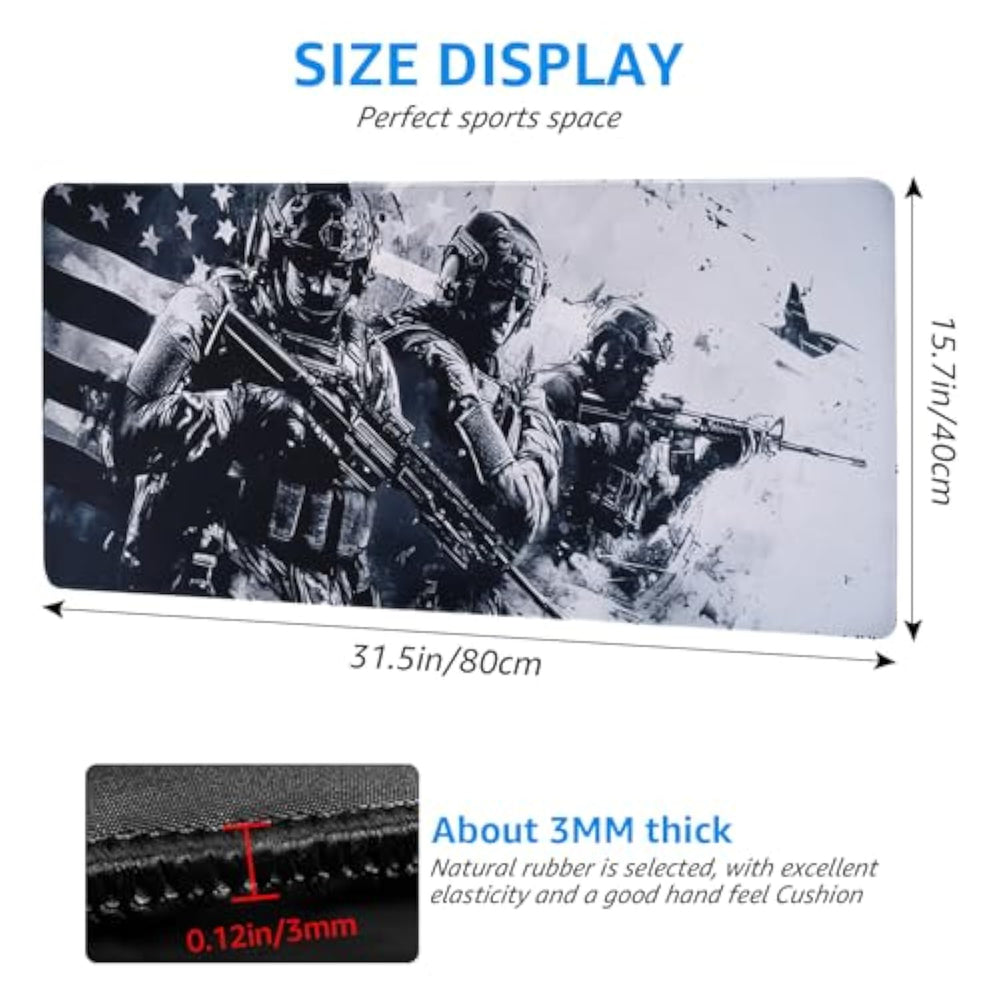 | Oversized Dimensions: Measures 31.5 X 15.7 Inches, Providing Extensive Coverage For Your Keyboard, Mouse, And Other Desktop Peripherals | | Patriotic Design: Striking Black And White Military Artwork With American Flag Backdrop Creates An Inspiring Atmosphere For Gaming And Work | | Surface Quality: Smooth, Engineered Surface Ensures Precise Mouse Tracking And Fluid Movements For Both Gaming And Professional Computing Tasks | | Waterproof Surface: Specialized Coating Protects Against Liquid Spills And Enables Easy Cleaning With A Simple Wipe Down To Maintain Pristine Condition | | Non-Slip Base: Specially Engineered Bottom Surface Keeps The Mouse Pad Firmly In Place During Intense Gaming Sessions And Daily Work Tasks | |