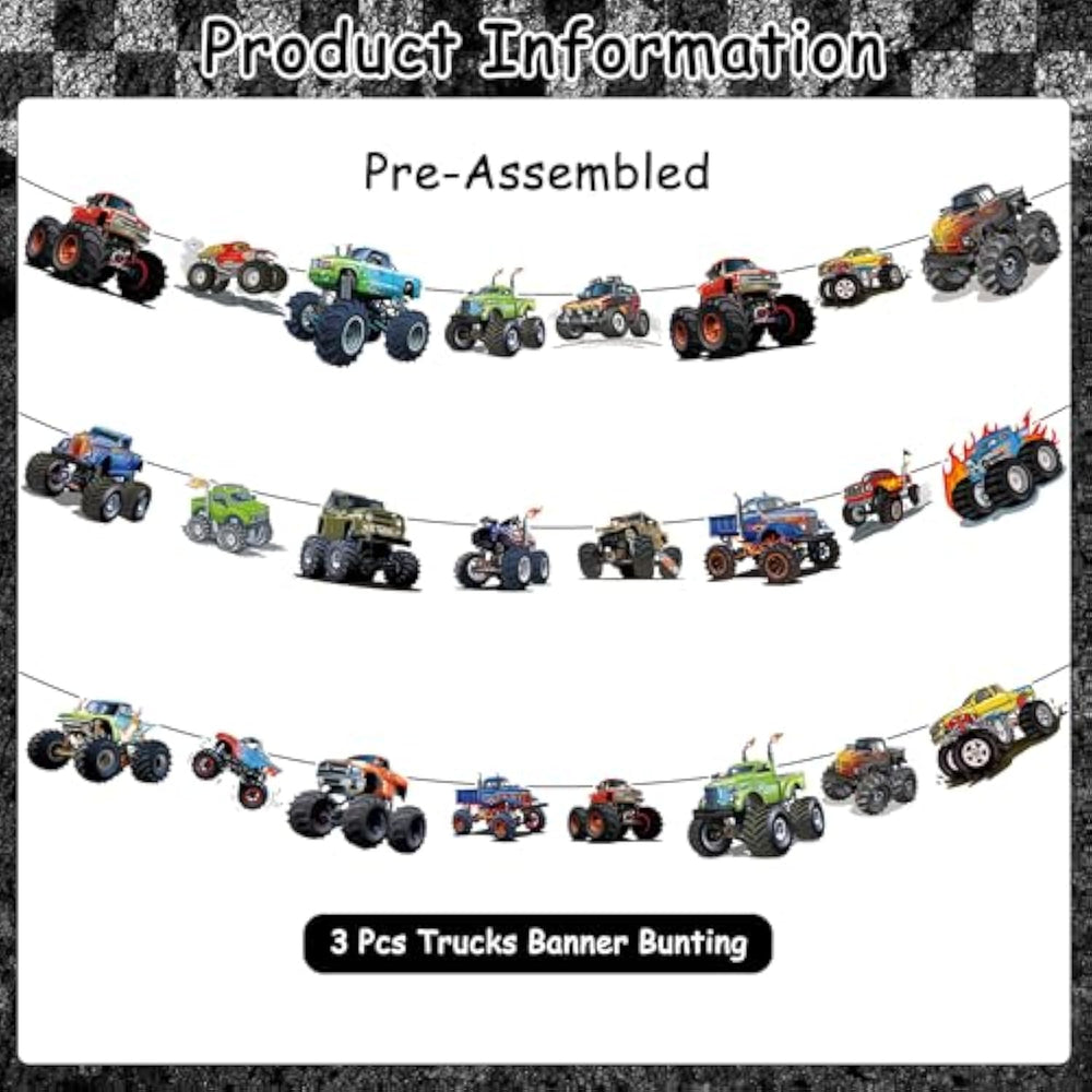 | Pre-Assembled Monster Truck Banner Bunting Garlands: No Setup Hassles! This Monster Truck Party Pack Includes 25 Styles Monster Truck Banner Bunting Garlands Pattern. Skip The Diy Stress—Our Monsters Trucks Banner Bunting Garlands Arrive Pre-Assembled And Ready To Hang! Each Garland Features Bold, Colorful Monster Truck And Off-Road Vehicle Cutouts Strung On Durable String, So You Can Instantly Transform Any Space In Minutes. No Scissors, Glue, Or Tangled Threads Required—Simply Unpack, Hang, And Watch The Party Come To Life. Perfect For Busy Parents, Party Planners, Or Anyone Who Wants To Focus On Celebrating, Not Setup! | | Monster Truck Designs: Designed For Little Truck Lovers, Each Banner Showcases Vibrant, Detailed Illustrations Of Monsters Trucks, Off-Road Vehicles, And Rugged Tires In Bold Colors (Think Fiery Reds, Deep Blues, And Neon Greens). The Dynamic Designs—Including Trucks Mid-Jump, Mud-Splattered Wheels—Add Energy And Excitement To Any Venue. Whether Hung Above A Dessert Table, Along Walls, Or Across Doorways, These Garlands Turn Ordinary Rooms Into An Off-Road Adventure Zone That Kids (And Adults!) Will Adore. | | Ideal Size: Each Card Measures Approximately 7 Inches By 5.5 Inches, Each About 8.2 Feet Long, Making It Suitable For A Variety Of Party Settings. The Size Of The Cards Is Perfect For Creating A Visual Impact Without Overwhelming The Space. The Ribbons Are Long Enough To Give You Flexibility In Where You Can Hang The Banner, Whether It'S Across A Mantlepiece, Over A Doorway, Or Along A Fence. | | Durable And Reusable: Crafted From Premium Card Stock, This Banner Is Both Sturdy And Lightweight, Making It Easy To Hang And Perfect For Reuse At Future Celebrations. The High-Quality Material Ensures That The Banner Can Withstand The Wear And Tear Of Multiple Parties, Maintaining Its Vibrant Appearance Through Each Joyous Occasion. It'S A Cost-Effective Solution That Allows You To Celebrate In Style Year After Year. | | Add Excitement To Your Party: Transform Your Special Day Into An Exhilarating Off-Road Adventure With Our Colorful Monster Truck Banner Party Decoration Supplies. This Set Is A Must-Have For Any Enthusiast Who Dreams Of Roaring Engines And Muddy Trails. The Pack Includes A 25 Styles Monsters Trucks Bunting Garland, Both Adorned With An Array Of Monsters Trucks That Are Sure To Catch The Eye Of Every Guest. Whether You'Re Throwing A Monster Truck Bash Party, A Little Monster Truck Birthday Party, Or Any Other Event With A Monster Truckgy Twist, This Banner Is The Perfect Addition To Create A Memorable Atmosphere. | |