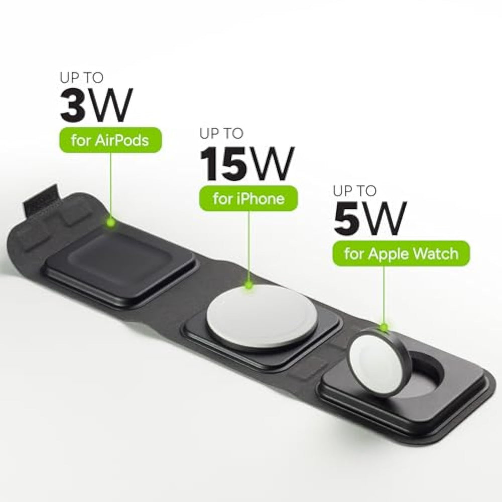 | MAGSAFE COMPATIBILITY: MFi Certified with a magnetic array for a secure, efficient charging experience with MagSafe-enabled iPhones and other Apple devices | | RAPID WIRELESS CHARGING: Experience up to 15W of fast charging, ensuring your device is powered up quickly and reliably | | TRAVEL-FRIENDLY DESIGN: Compact and foldable, this charger fits into a sleek travel case, transforming any space into a convenient charging station | | MULTI-DEVICE CHARGING: Simultaneously charge your iPhone, Apple Watch, and AirPods with designated, optimized charging spots for each device | | COMPLETE CHARGING SOLUTION: Includes a magnetic Apple Watch charger, a specific spot for AirPods, a USB-C cable, and a 30W USB-C PD wall adapter | |