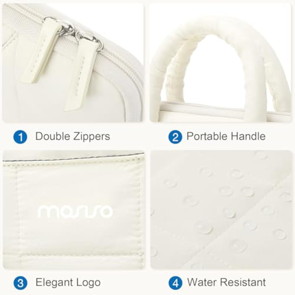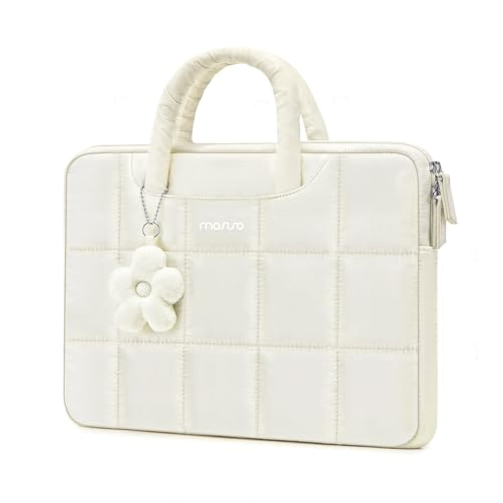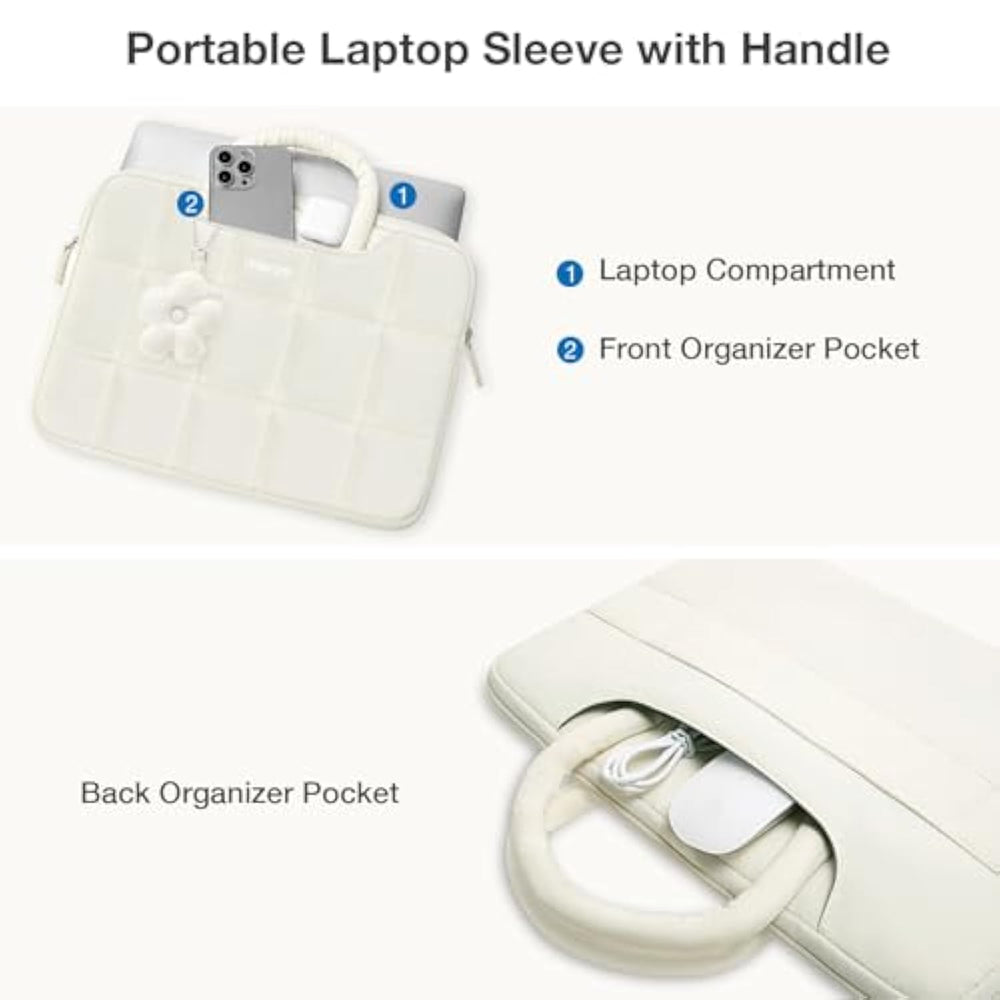 | Internal Dimensions: 13.58 x 9.44 x 0.78 inches (L x W x H); External Dimensions: 14.17 x 10.03 x 0.78 inches (L x W x H). Front pockets dimension: 13.38 x 6.88 inches (L x W). | | Made with soft lightweight rectangle quilted puffy polyester material, features a polyester foam padding layer and fluffy fleece fabric lining. Protect your laptop from bump, shock and accidental scratches. Front back organizer pockets provide enough space to keep mouse, earphone, pens and notepads, offering added convenience. | | Comfortable padded handle, this laptop sleeve is lightweight and stylish, making it the perfect accessory for young women going out. It's a perfect companion for work, travel and leisure, without adding any extra weight. This computer bag features a stylish rectangle quilted and a detachable elegant flower pendant, seamlessly combining fashion and functionality. | | Considerate design is the back trolley suitcase belt for ease use during business trip. It is really convenient for your happy journey to any where. Slim and lightweight; does not bulk your laptop up and can easily slide into your briefcase, backpack, or other bag. This portable laptop carrying case cover bag is ideal for you to take your laptop out. | | Compatible with MacBook Pro 14 inch 2025-2021 M4 A3112 A3185 A3401 M3 A2918 A2992 M2 A2779 M1 A2442, compatible with MacBook Air 13 A1369 A1466 2010-2017, compatible with MacBook Pro 13 A1425 A1502 A1278 2008-2015; Compatible with Surface Book 3/2/1 13.5, compatible with Surface Laptop 13.8 inch 2024, Surface Laptop 4/3/2/1 13.5; Compatible with Dell Latitude 14; Compatible with HP Elitebook 13.3/Spectre X360 13.3/Envy 13/Stream 13/Stream 14/Pavilion 14; compatible with Lenovo IdeaPad 13/14. | |