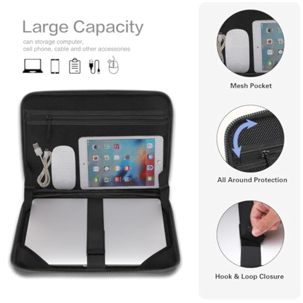 | Dimensions: Internal Dimensions: 12.99 x 9.25 x 1.18 inches (L x W x H), external dimensions: 13.58 x 9.84 x 1.18 inches (L x W x H), internal mesh pocket dimensions: 10.43 x 9.25 inches (L x W). | | Waterproof Shockproof: Made of symmetrical trapezoid PU EVA material, shockproof, dustproof and waterproof. Iinterior computer pocket with hook and loop fastener can prevent your laptop from shock, scratches and bumps, firm your laptop in right place without any unwanted movement and shaking. The laptop sleeve bag with extendable handle can be fully opened at 180 degree, easily access your laptop and inner pocket allow you put your laptop in the bag conveniently. | | Shock Resistant Foam: Features internal upgraded shock resistant bubble foam padding layer, better protect your valuable laptop from accidental scratches. You can alter how to carry depending on your needs. Allows you to switch between a laptop briefcase and laptop sleeve bag. | | Easy to Carry: Inner mesh pocket provides enough space to keep mouse, earphone, pens and notepads, offering added convenience. Extendable handle design makes it to carry your laptop around in comfort, you can also tuck away the handle. | | Compatible with MacBook Air 13 13.3 13.6 inch M3 A3113 M2 A2681 M1 A2337 A2179 A1932 A1369 A1466 2010-2025, compatible with MacBook Pro 14 inch 2025-2021 M4 A3112 A3185 A3401 M3 A2918 A2992 M2 A2779 M1 A2442, compatible with MacBook Pro 13 2008-2025 M2 A2338 M1 A2251 A2289 A2159 A1989 A1708 A1706 A1425 A1502 A1278; Compatible with Surface Laptop 13.8/Surface Book 3/2/1 13.5/Surface Laptop 4/3/2/1 13.5; Compatible with Dell XPS/Latitude 13; Compatible with HP Elitebook/Spectre/Envy/Stream 13. | |