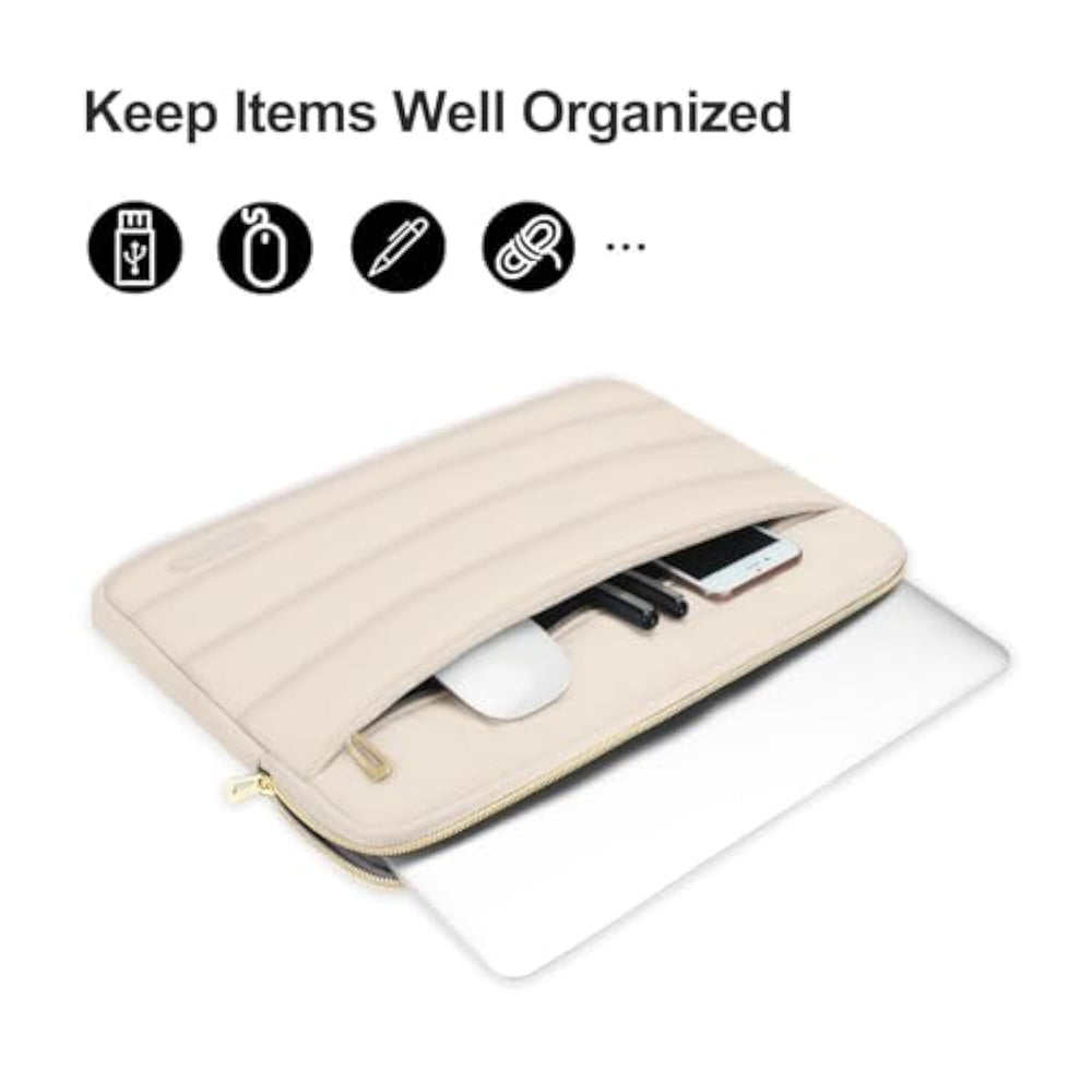 | Internal Dimensions: 15.15 x 10.23 x 0.79 inches (L x W x H); External Dimensions: 15.75 x 10.83 x 0.79 inches (L x W x H). Front horizontal pocket dimension: 12.99 x 7.87 inches (L x W). The additional small pouch bag dimension: 7.87 x 4.33 x 1.38 inch (L x W x H); | | Made with soft touch puffy polyester material, features a polyester foam padding layer and fluffy fleece fabric lining. Protect your laptop from bump, shock and accidental scratches. | | Additional small storage pouch bag for you to storage laptop mouse and earphone. Same color as the big sleeve bag, harmony and stylish. This portable protective carrying sleeve case cover bag with small pouch is ideal for you to take your laptop out. | | Slim and lightweight; does not bulk your laptop up and can easily slide into your briefcase, backpack or other bag. Top-loading zipper on the sleeve glides smoothly and allows convenient access to your laptop computer. The bag is perfect for working, traveling, daily use and business travel. | | Compatible with MacBook Pro 16 inch 2025-2019 M4 A3403 A3186 M3 A2991 M2 A2780 M1 A2485 A2141, compatible with MacBook Pro Retina 15.4 A1398; Compatible with Surface Book 3/2/1 15; Compatible with ASUS ZenBook/VivoBook Go 15.6; Compatible with Lenovo Essential IdeaPad/IdeaPad 3i Chromebook/IdeaPad 1/V15 15.6; Compatible with Acer Aspire Go 15.6; Compatible with NIMO 15.6, Compatible with HP Victus/ProBook/Spectre/Envy/Omen/Pavilion 15.6; Compatible with Dell Inspiron/XPS/Vostro/Latitude 15.6. | |