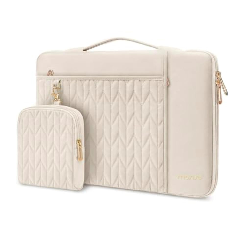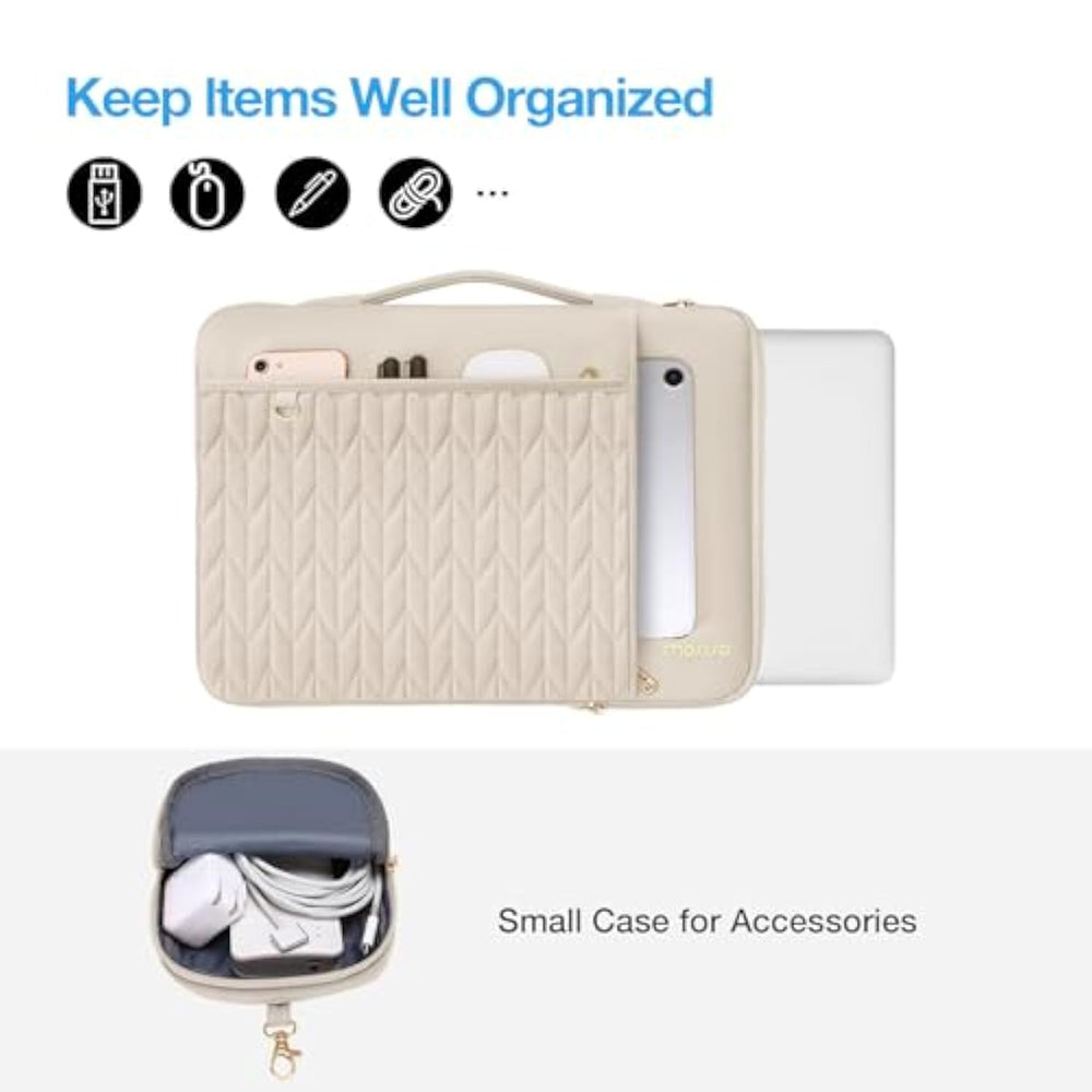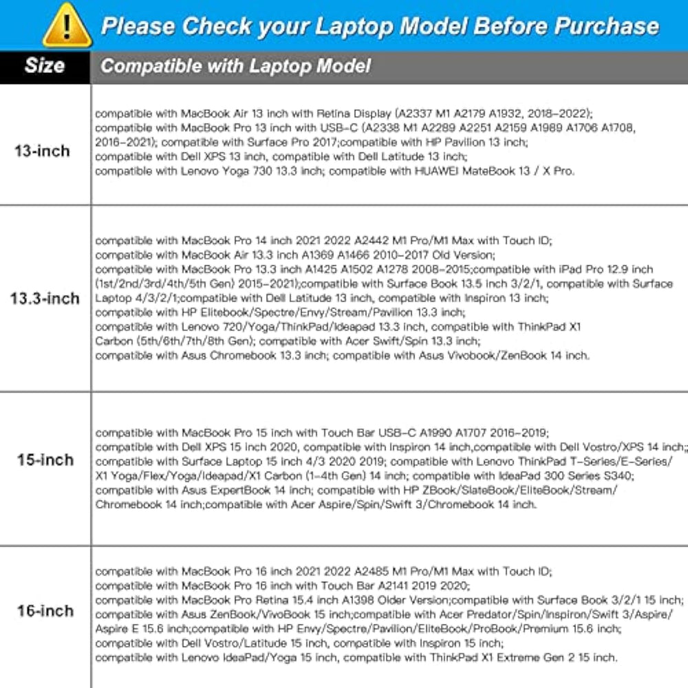 | Internal Dimensions: 15.35 x 10.75 x 0.79 inches (L x W x H); External Dimensions: 16.34 x 11.02 x 0.79 inches (L x W x H). The additional small pouch bag dimension: 6.89 x 5.04 x 0.98 inch (L x W x H). Front horizontal pocket dimensions: 10.82 x 8.23 inches (L x W). Front vertical pocket dimensions: 11.02 x 9.06 inches (L x W). | | Made with durable petal quilted polyester material. Features a polyester foam padding layer and fluffy cushion for bump and shock absorption and protection of your device against dust, dirt, bump, shock and accidental scratches. Front horizontal vertical pockets provide enough space to keep pens notebooks, offering added convenience. | | Additional small storage pouch bag for you to storage laptop mouse and earphone. Same color as the big sleeve bag, harmony and stylish. Simple and exquisite petal quilted appearance carrying sleeve case cover bag is ideal for you to take your laptop out. | | Considerate design is the back trolley suitcase belt for ease use during business trip. It is really convenient for your happy journey to any where. Slim and lightweight; does not bulk your laptop up and can easily slide into your briefcase, backpack, or other bag. | | Compatible with MacBook Pro 16 inch 2024-2021 M4 A3403 A3186 M3 A2991 M2 A2780 M1 A2485 Pro Max Touch ID, compatible with MacBook Pro 16 A2141 2019 2020, compatible with MacBook Pro Retina 15.4 A1398; Compatible with Surface Book 3/2/1 15; Compatible with Asus ZenBook/VivoBook 15; Compatible with Acer Swift 3 14/Swift 5 15.6, compatible with Acer Aspire 3/5/7 15.6; Compatible with HP ProBook/Spectre x360/Envy x360/HP Omen/Pavilion x360 15.6; Compatible with Dell XPS/Vostro/Latitude 15. | |