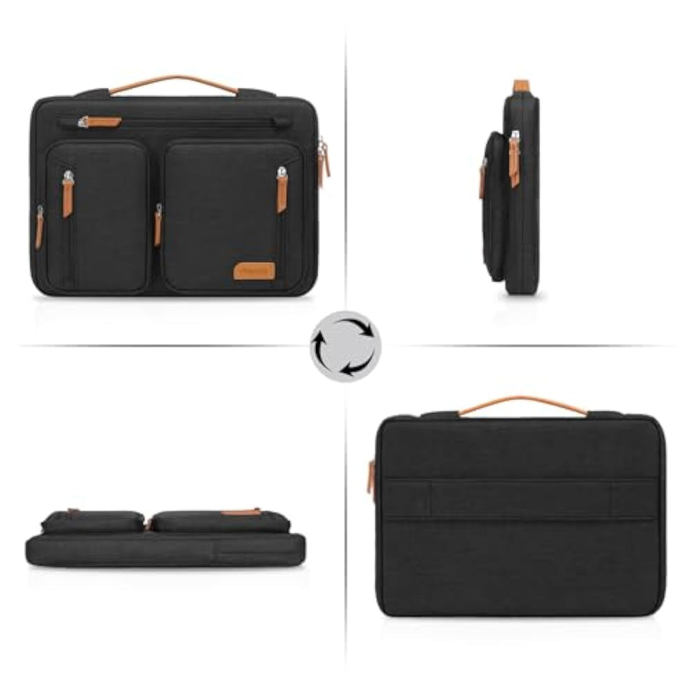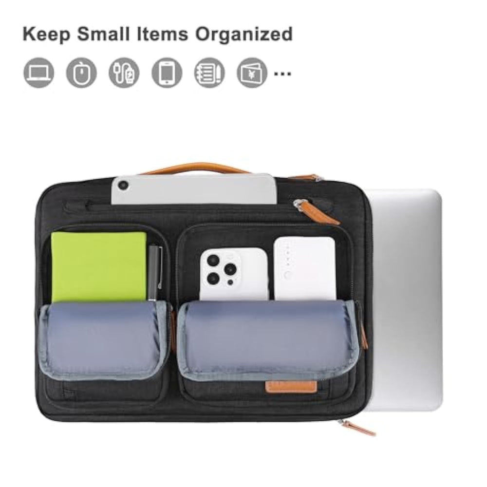 | Internal dimensions: 13.78 x 9.64 x 0.79 inches (L x W x H); External dimensions: 14.37 x 10.23 x 0.79 inches (L x W x H). Horizontal pocket dimensions: 11.61 x 8.26 inches (L x W). Left raised pocket dimensions: 4.92 x 7.08 inches (L x W). Right raised pocket dimensions: 7.08 x 6.89 inches (L x W). Left vertical pocket dimensions: 3.74 x 6.29 inches (L x W). Right vertical pocket dimensions: 5.53 x 6.29 inches (L x W). | | 360 degree all around protective reinforced interior edge briefcase carrying case bag protect your laptop from any accidental dropping. Extendable handle design makes it to carry your laptop around in comfort, you can also tuck away the handle. Side opening zipper design, avoid accidental dropping of your laptop while carrying. 5 front accessory zipper pockets provide enough space to keep mouse, earphone, pens and notepads, offering added convenience. | | The laptop sleeve with organizer pockets outer polyester fabric of the case enable you to carry your laptop / notebook / Ultrabook computer in a uniquely sleek style. Features a polyester foam padding layer and fluffy cushion for bump and shock absorption and protection of your device against dust, dirt, bump, shock and accidental scratches. | | Considerate design is the back trolley suitcase belt for ease use during business trip. It is really convenient for your happy journey to any where. Slim and lightweight; does not bulk your laptop up and can easily slide into your briefcase, backpack, or other bag. This protective carrying sleeve case cover bag with handle and pockets is ideal for you to take your laptop out. | | Compatible with MacBook Pro 14 inch 2025-2021 M4 A3112 A3185 A3401 M3 A2918 A2992 M2 A2779 M1 A2442, compatible with MacBook Air 13 A1369 A1466 2010-2017, compatible with MacBook Pro 13 A1425 A1502 A1278 2008-2015; Compatible with Surface Book 3/2/1 13.5, compatible with Surface Laptop 13.8 inch 2024, Surface Laptop 4/3/2/1 13.5; Compatible with Dell Latitude 14; Compatible with HP Elitebook 13.3/Spectre X360 13.3/Envy 13/Stream 13/Stream 14/Pavilion 14; compatible with Lenovo IdeaPad 13/14. | |
