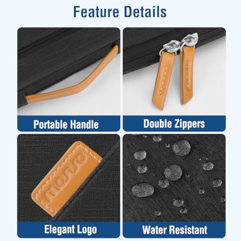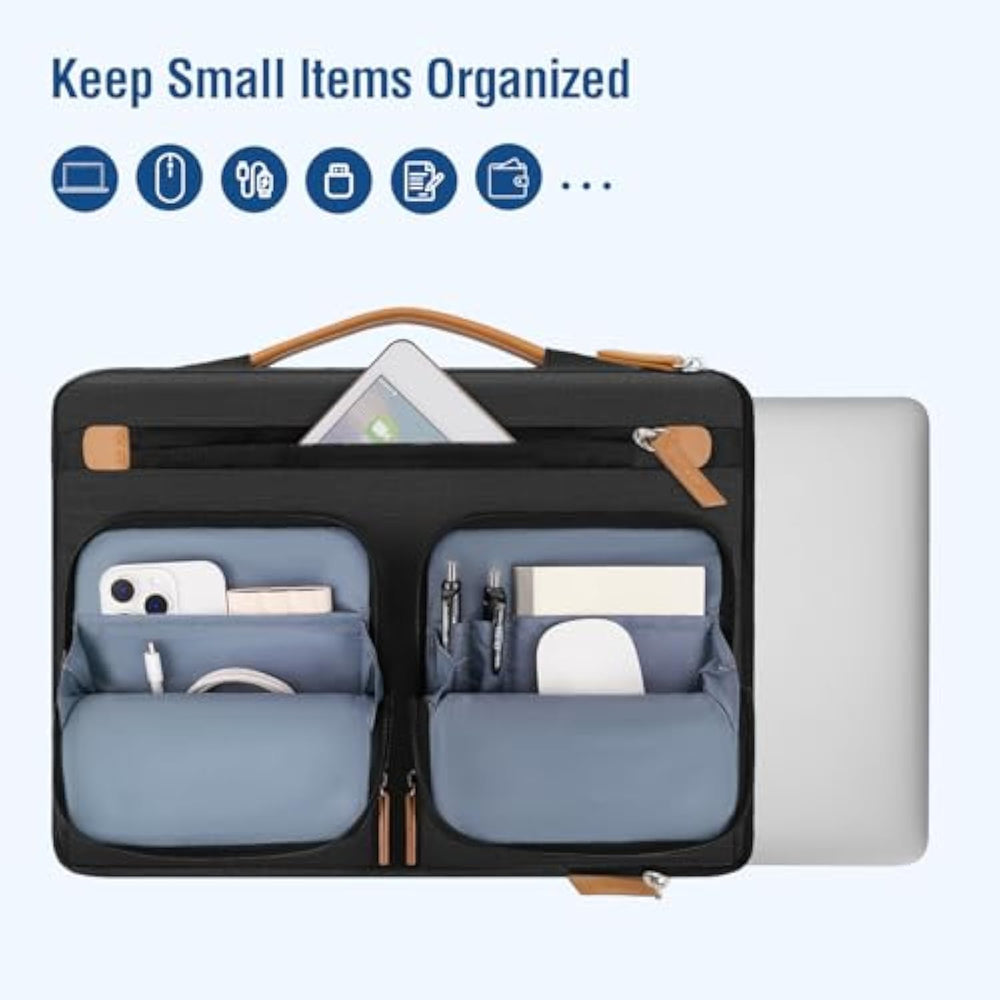 | Internal dimensions: 13.77 x 9.6 x 0.98 inches (L x W x H); External dimensions: 14.17 x 10.43 x 0.98 inches (L x W x H). Horizontal zipper pocket dimensions: 9.84 x 8.26 inches (L x W); Two raised square zipper pocket dimensions: 6.29 x 6.29 (L x W). Right vertical zipper pocket dimensions: 4.72 x 4.62 inches (L x W). | | 360 degree all around protective reinforced interior edge briefcase carrying case bag protect your laptop from any accidental dropping. Extendable handle design makes it to carry your laptop around in comfort, you can also tuck away the handle. Side opening zipper design, avoid accidental dropping of your laptop while carrying. 4 front zipper pockets provide enough space to keep mouse, earphone, pens and notepads, offering added convenience. | | The laptop sleeve with 4 front organizer zippers pockets outer polyester fabric of the case enable you to carry your laptop / notebook / Ultrabook computer in a uniquely sleek style. Features a polyester foam padding layer and fluffy cushion for bump and shock absorption and protection of your device against dust, dirt, bump, shock and accidental scratches. | | Considerate design is the back trolley suitcase belt for ease use during business trip. It is really convenient for your happy journey to any where. Slim and lightweight; does not bulk your laptop up and can easily slide into your briefcase, backpack, or other bag. This protective carrying sleeve case cover bag with handle and pockets is ideal for you to take your laptop out. | | Compatible with MacBook Air 13 13.3 13.6 inch M4 A3240 M3 A3113 M2 A2681 M1 A2337 A2179 A1932 A1369 A1466 2010-2025, compatible with MacBook Pro 14 2025-2021 M4 A3112 A3185 A3401 M3 A2918 A2992 M2 A2779 M1 A2442,compatible with MacBook Pro 13 2008-2025 M2 A2338 M1 A2251 A2289 A2159 A1989 A1708 A1706 A1425 A1502 A1278; Compatible with Surface Laptop 13.8/Surface Book 3/2/1 13.5/Surface Laptop 4/3/2/1 13.5; Compatible with Dell XPS/Latitude 13; Compatible with HP Elitebook/Spectre/Envy/Stream 13. | |