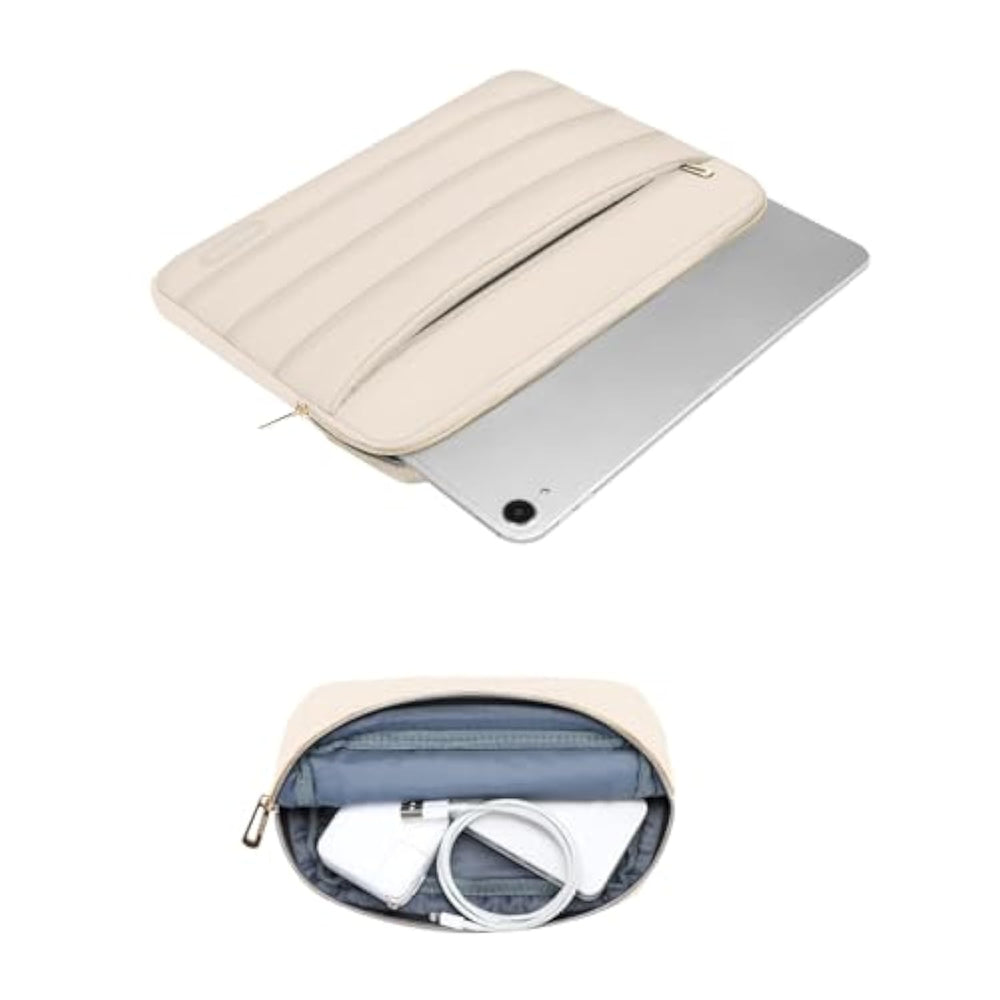 | Internal Dimensions: 11.41 x 8.58 x 0.79 inches (L x W x H); External Dimensions: 12.20 x 8.93 x 0.79 inches (L x W x H). Front horizontal pocket dimension: 9.25 x 6.10 inches (L x W). The additional small pouch bag dimension: 7.87 x 4.33 x 1.38 inch (L x W x H). | | Made with puffy soft touch polyester material, features a polyester foam padding layer and fluffy fleece fabric lining. Protect your tablet from bump, shock and accidental scratches. Additional small storage pouch bag for you to keep mouse and earphone well organized. Same color as the big sleeve bag, harmony and stylish. This durable protective carrying sleeve case cover bag with small pouch is ideal for you to take your tablet out. | | Slim and lightweight; does not bulk your tablet up and can easily slide into your briefcase, backpack or other bag. | | Top-loading zipper on the sleeve glides smoothly and allows convenient access to your tablet. The bag is perfect for working, traveling, daily use and business travel. | | Compatible with iPad Air 11 M3 2025, iPad A16 2025, iPad Pro 11 M4 2024, iPad Air 11 M2 2024, iPad Pro 11 M2 M1 2022-2018 with Magic Keyboard/Smart Keyboard Folio, iPad 10th 10.9 2022, iPad 9th/8th/7th 10.2 2021/2020/2019, iPad Air 5/4th 10.9 2022/2020, iPad Air 3rd 10.5 2019, iPad Pro 10.5 inch 2017, iPad 9.7 6th/5th 2018/2017, iPad 1/2/3/4, iPad Air / Air 2; Surface Go 2/3 10.5, Surface Go 10 inch 2018; Galaxy Tab A9+/S9/S8/Plus 11, Galaxy Tab A8 10.5, Galaxy Tab A7 10.4 2020, Fire HD 10. | |