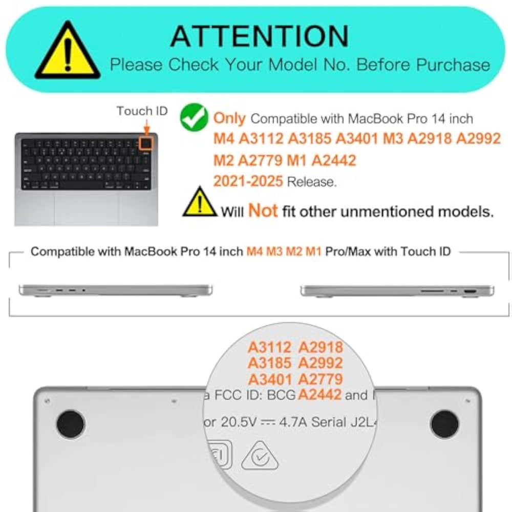 | Designed ONLY to be compatible with MacBook Pro 14 inch cover 2025 2024 2023 2023 2021 Release M4 Max / M4 Pro / M4 / M3 Pro / M3 Max / M3 / M2 Pro / M2 Max / M1 Pro / M1 Max Chip with Liquid Retina XDR Display Touch ID (models: A3112 A3185 A3401 A2918 A2992 A2779 A2442). | | Please kindly check the model number "Axxxx" on the back of the laptop before your purchase, make sure you choose the exact same model number as the listing title stated "A3112" or "A3185" or "A3401" or "A2918" or "A2992" or "A2779" or "A2442" that compatible with MacBook Pro M4 14 inch case, compatible with MacBook Pro M3 14 inch case, compatible with MacBook Pro M2 14 inch case and compatible with MacBook Pro M1 14 inch case. WARNING: This case is NOT compatible with other model laptops. | | The 360 degree protective shockproof laptop sleeve with handle carrying bag internal dimension: 13.39 x 9.25 x 0.79 inches (L x W x H); external dimension: 13.98 x 9.84 x 0.79 inches (L x W x H). The front side pocket dimension: 11.61 x 9.25 inches (L x W). Made of polyester material, protect your laptop against accidental spills. Slim and lightweight, does not bulk your device up and can easily slide into your briefcase, backpack or other bag. Ideal for business, daily and travel. | | The ultra slim webcam cover sticker is perfect and convenient to provide privacy security and peace of mind to individuals, families, groups, companies and organizations, it will not add any thickness and weight to the device. Cover your webcam when not in use and prevent web hackers from spying on your life. | | Including 1 matching color keyboard cover 1 screen protector to protect your laptop keyboard screen against spills. | |