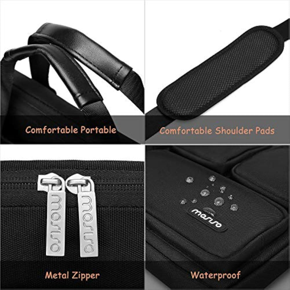 | Internal dimensions: 14.17 x 10.63 x 1.81 inches (L x W x H); External dimensions: 14.96 x 11.42 x 2.36 inches (L x W x H). Left pocket dimensions: 7.87 x 4.13 x 0.98 inches (L x W x H). Two smaller pockets dimensions: 3.94 x 3.89 x 0.98 inches (L x W x H). Right corner pocket dimension: 8.27 x 3.94 x 0.98 inches (L x W x H). | | The main inner compartment holds your laptop and other important things. Four front pockets is convenient for quick-access and store cell phone, pen slots, wallet, keys and other small items. Multifuncional 4 front pockets design laptop shoulder bag enables you to carry your laptop/notebook/ultrabook computer in a uniquely sleek style. | | 360 degree all around protective reinforced interior edge briefcase carrying case bag protect your laptop from any accidental dropping. Features a polyester foam padding layer and fluffy fleece fabric lining for bump and shock absorption and protection of your computer from accidental scratches. Top-loading double zipper on the bag glides smoothly and allows convenient access to your laptop computer. | | Removable and adjustable padding shoulder strap with a shoulder pad varied from 31.5 inch to maximum 52 inch and dual sturdy handles for long time comfortably carrying, top handles also can tuck away in the pockets when not needed. Considerate design is the back trolley suitcase belt for ease use during business trip. It is really convenient for your happy journey to any where. | | Compatible with MacBook Pro 14 inch 2021-2023 A2779 M2 A2442 M1 Pro/Max Touch ID, compatible with MacBook Air 13 inch A1369 A1466 2010-2017, compatible with MacBook Pro 13 inch A1425 A1502 A1278 2008-2015; Compatible with Surface Book 3/2/1 13.5, compatible with Surface Laptop 4/3/2/1 13.5; Compatible with Dell Latitude 14; Compatible with HP Elitebook 13.3/Spectre X360 13.3/Envy 13/Stream 13/Stream 14/Pavilion 14; Compatible with Lenovo ThinkPad X1 Carbon; compatible with Lenovo IdeaPad 13/14. | |