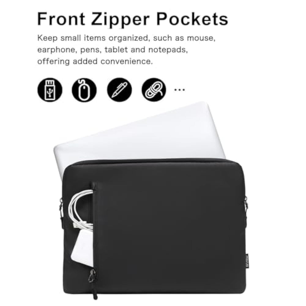 | Internal dimensions: 13.77 x 10.43 x 0.59 inches (L x W x H); External dimensions: 14.37 x 10.62 x 0.59 inches (L x W x H). The front left vertical pocket dimensions: 6.88 x 6 inches (L x W). | | Made with polyester material, top opening zippers gliding smoothly and allowing convenient access to your device. Slim and lightweight, does not bulk your device up and can easily slide into your briefcase, backpack or other bag. This portable protective laptop sleeve case is perfect for women and men for daily use, business trip, travel, home, office etc. | | Extra front pocket at left side provides enough space to keep mouse, earphone, pens and notepads, offering added convenience. This protective carrying sleeve case cover bag with pocket is ideal for you to take your laptop notebook computer out. | | Features a polyester foam padding layer and fluffy fleece fabric lining for bump and shock absorption and protection of your device against bump, shock and accidental scratches. | | Compatible with MacBook Air 13 13.3 13.6 inch M3 A3113 M2 A2681 M1 A2337 A2179 A1932 A1369 A1466 2010-2025, compatible with MacBook Pro 14 inch 2025-2021 M4 A3112 A3185 A3401 M3 A2918 A2992 M2 A2779 M1 A2442, compatible with MacBook Pro 13 2008-2025 M2 A2338 M1 A2251 A2289 A2159 A1989 A1708 A1706 A1425 A1502 A1278; Compatible with Surface Laptop 13.8/Surface Book 3/2/1 13.5/Surface Laptop 4/3/2/1 13.5; Compatible with Dell XPS/Latitude 13; Compatible with HP Elitebook/Spectre/Envy/Stream 13. | |