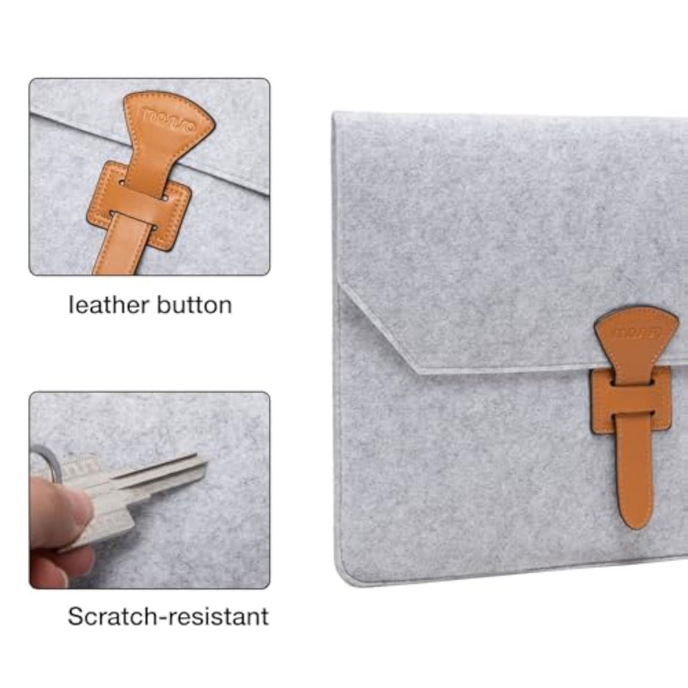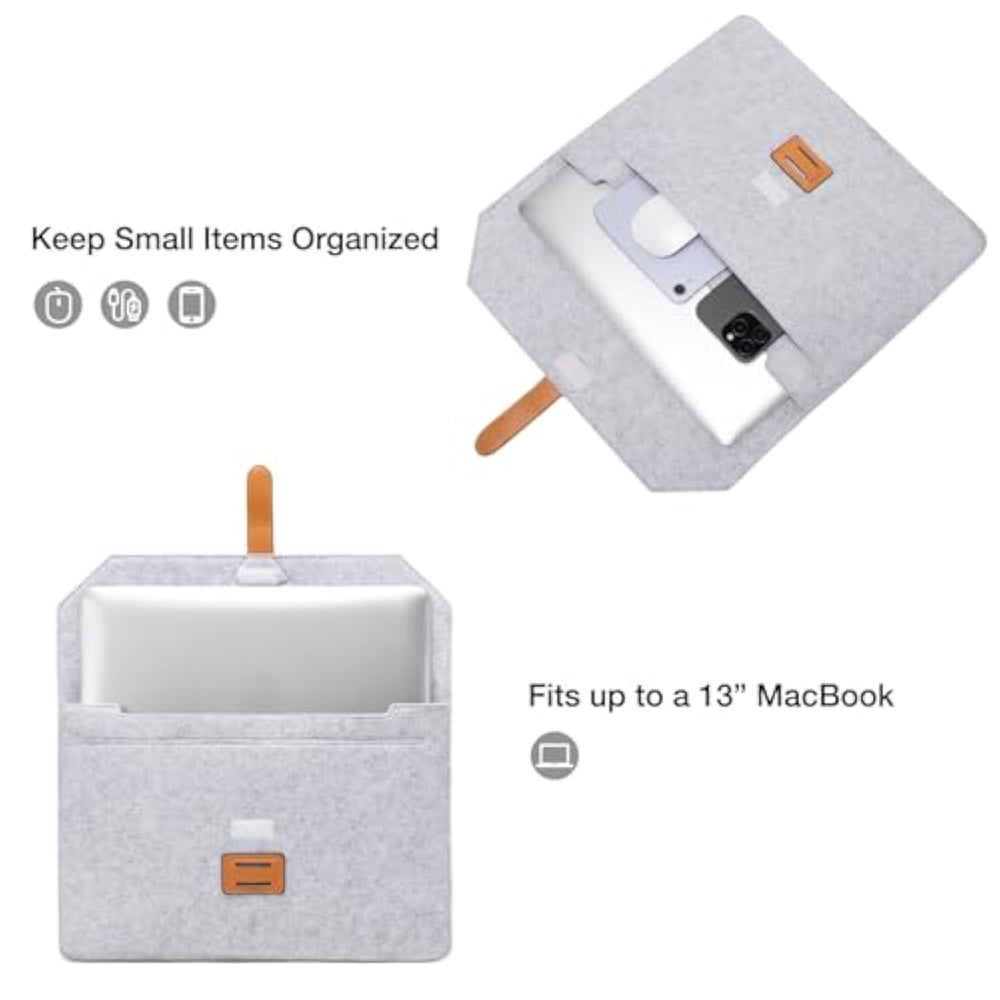 | Internal dimension: 14.17 x 10.23 x 0.39 inches (L x W x H); External dimension: 14.76 x 10.82 x 0.39 inches (L x W x H).The front pocket dimension: 14.76 x 9.25 inch (L x W). The back each pocket dimension: 6.88 x 4.52 inch (L x W). | | Made with felt material. Slim and lightweight, does not bulk your device up and can easily slide into your briefcase, backpack or other bag. Inner soft material protects your laptop against scratches and bumps. The front back pockets are used for cellphone, mouse, earphone, wallet, pens, notepads and more, offering added convenience. | | This protective felt flapover slim carrying sleeve bag with front buckle pockets is ideal for you to take your laptop notebook computer out. Felt material enables you to carry your laptop in a uniquely sleek style. Hook loop fastening closure keeps your laptop securely. | | Envelope flapover design gives a simple and elegant appearance. The bag is suitable for working, office, traveling, home, daily life use and business travel. | | Compatible with MacBook Pro 14 inch 2025-2021 M4 A3112 A3185 A3401 M3 A2918 A2992 M2 A2779 M1 A2442, compatible with MacBook Air 13 A1369 A1466 2010-2017, compatible with MacBook Pro 13 A1425 A1502 A1278 2008-2015; Compatible with Surface Book 3/2/1 13.5, compatible with Surface Laptop 13.8 inch 2024, Surface Laptop 4/3/2/1 13.5; Compatible with Dell Latitude 14; Compatible with HP Elitebook 13.3/Spectre X360 13.3/Envy 13/Stream 13/Stream 14/Pavilion 14; compatible with Lenovo IdeaPad 13/14. | |