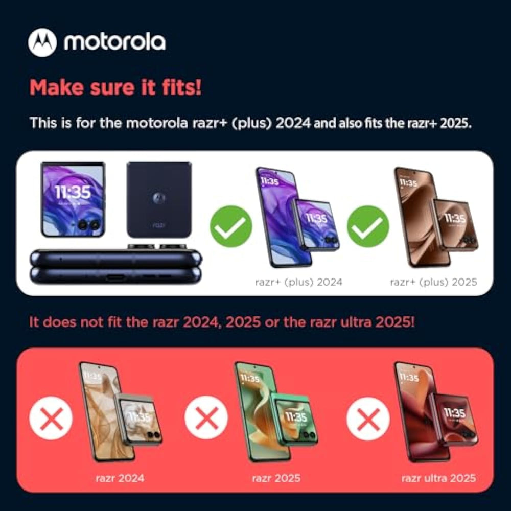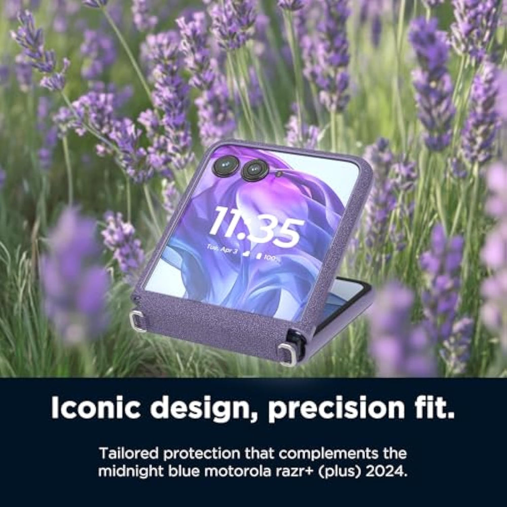 | Iconic Cross Body Protection- Beautifully stylish and functional protection for the new motorola razr+ (plus) 2024 designed to complement the midnight blue color. Please note that the color is fresh lavender- not navy. | | Precision Fit and Function- This case is precision-engineered with CNC machined cutouts that are perfectly tailored to the Motorola Razr 2024. It securely holds your phone with interior adhesive strips, ensuring every corner, button, and sensor is fully accessible. Case is fully compatible with the Razr's Qi wireless charging function. | | Lanyard Hinge Design- Fashion meets function with this adjustable, detachable strap case which gives you plenty of ways to carry your razr comfortably and securely. Keep your phone accessible while making a bold statement. | | Elegant Suede Texture - Protection has never felt better, as this case has a soft, smooth suede exterior which looks and feels great. The case shells are made from rigid polycarbonate that adds everyday threat protection. | | Motorola Original- Motorola Razr+ (Plus) 2024 Fresh Lavender Cross Body Case with Vegan Leather Adjustable Lanyard - Please make sure your phone is the Motorola Razr+ (Plus) 2024 to ensure it fits! | |