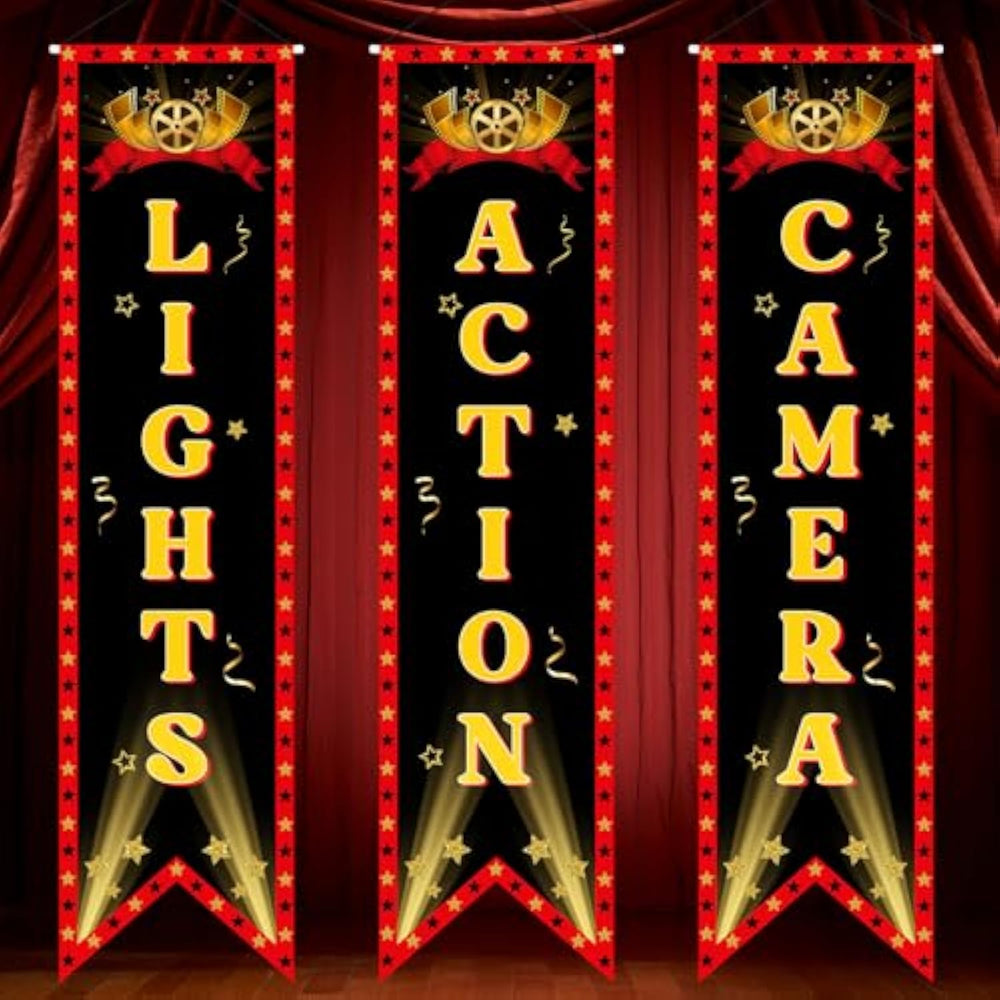| Unique Movie Night Design: Designed With A Bold Hollywood Theme, This Hollywood Theme Banner Features The Classic Phrase “Lights, Camera, Action” In Bright Yellow Letters. The Black Background, Red Border, Gold Stars, And Film Reel Details Create A Fun, Movie-Theater Vibe—Perfect For Adding Drama To Your Party Entrance. | | Perfect Size For Outdoor Display: Each Movie Party Banner Measures Approximately 47.2 X 12 Inches, Making It An Eye-Catching Decoration For Front Doors, Porch Rails, Party Entrances, Or Indoor Walls. A Great Way To Welcome Your Guests! | | High-Quality Durable Material: This Movie Night Decor Is Made From Premium Polyester Fabric, Reusable, Lightweight, And Easy To Hang. Suitable For Both Indoor And Outdoor Use, Even In Wind Or Light Rain. | | Easy To Hang Store: Comes With Pre-Assembled Hanging Ropes At The Top, Making It Quick To Hang On Your Porch, Doorway, Or Garage Wall. Folds Flat For Easy Storage And Multiple Uses. | | Great For All Movie-Themed Occasions: Ideal For Home Movie Nights, Birthday Parties, Outdoor Cinema Events, Graduation Screenings, Or School Celebrations. A Fun And Festive Decoration For Any Film Lover! | |
