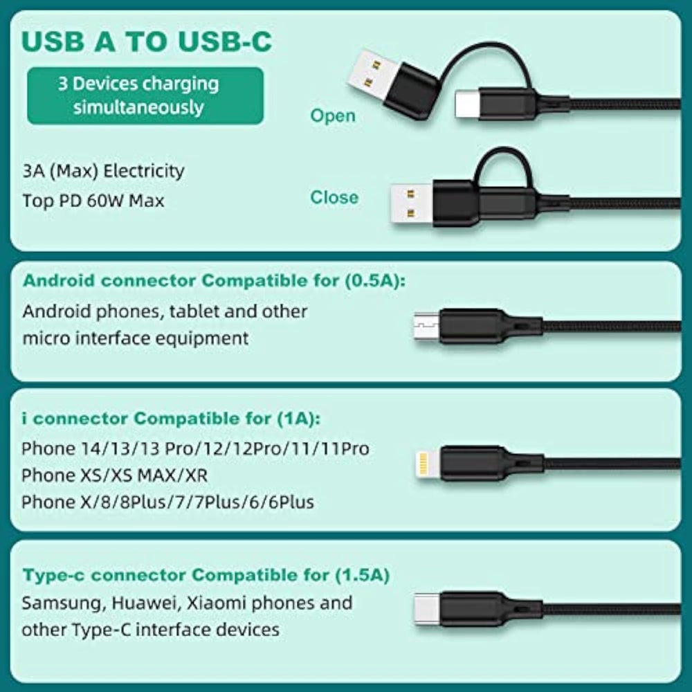 | [ 6Ft 3 In 2 Charging Cable ] 2 In 1 Usb A / C With 3 In 1 Multi-Cable, This Multi Charging Cable Is Unique Brings You Convenience And Sharing Feeling. 3 Charging Tips In 2 Cable Make The Cell Phone Charger Simple, Lightweight And Portable. One Cable For All To Simultaneously Charge Multiple Devices. | | [ Extra Long Perfect Fit ] 3Pack 6Ft Multi Phone Charger Cable With You Anywhere. Long Enough To Reach Limited Outlets. It'S Perfect For You To Charge Your Phone When Laying On Sofa, Bed Or Sitting In The Backseat Of The Car And So On, Perfect For Home Use And Office Or Business And Travel.! Bring One Multi Usb Cable, Meets All Your Demand. | | [ Super Compatibility ] Compatible With All Smartphones, Usb C Port Supports To Samsung, Lg And More. Micro Usb Port Compatible With Samsung Galaxy S7/S6/S4 Most Android Phones, Compatible With Kindle, Compatible With Samsung Tablets, Bluetooth Headset, External Batteries, Ps4 Controllers And More ( Only Lightning Port Support 480Mbps Transfer Data). | | [ Durability Flexible ] Multi Charger Cable Is Well Made With Nylon Braided And Aluminium Alloy. With Tested 6000+ Bend Lifespan, Our Usb Charging Cords Are Still Sturdy And Strong. The Cord Is Also Tangle Free And Flexible Which Makes Your Life More Convenient. | | [ What You Get ] 3 Pack 3-In-2 Multi Usb Charging Cable. We Provide 12 Months. If You Have Any Problems Or Concerns, Please Feel Free To