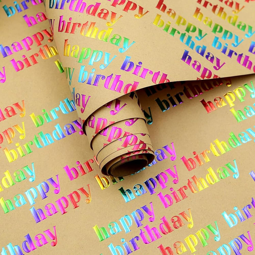 | Design: Happy Birthday, With Beautiful Colorful Glitter Iridescent Luster. Multi-Colored Foil "Happy Birthday" Lettering On Brown Recyclable Kraft Wrapping Paper Material: Fully Recyclable Kraft Paper With A Weightness Of 80Gsm And Made From Materials Sourced From Well Managed Forests Mini Roll Dimension: 17 Inches Wide, 120 Inch (10 Feet) Long, 14 Square Feet Per Roll.Log Color On The Reverse. But You Could See The Letter Print As We Use Embossing Printing Process Of Concave And Convex Perm. Birthday Theme: Suitable For Birthday Gift Wrapping, Wall And Bulletin Board Decorations Easy To Use: Short Rolls Are Easier To Store And Use, Perfect For Small Boxes