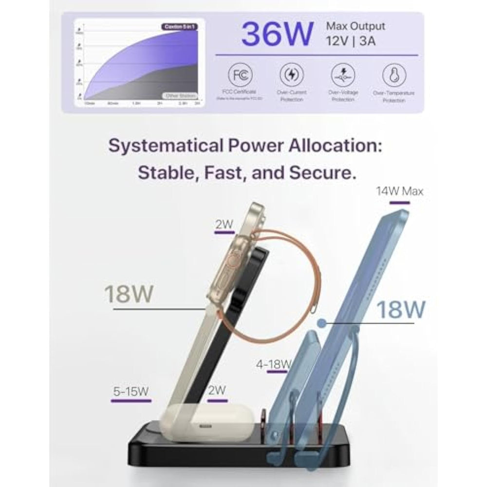 | [5-In-1 Charging Revolution]Experience Seamless Charging For All Your Essential Devices With Our 5-In-1 Wireless Charger. Designed For Iphone 16E/16/16 Pro/16 Pro Max To Iphone 8 Series, Apple Watch Ultra 2/10/9/8/7/Se/6/5/4/3/2, Airpods 4 With Active Noise Cancellation/3/2/1/Pro1/2, Ipad Series, And Type-C Devices.????????: ?????? ??????????/??????????/ ?????????????? ?? ?????????????? ???????????? ?????????? ???????????????????????? ???? ?????? ?????????????? ???????????????? ????????????????. | | [Compact Space Saver]Maximize Your Workspace With This 5-In-1 Charging Station. Designed To Organize And Charge Your Apple Devices, It Features A Built-In Partition To Keep Your Desk Or Nightstand Tidy. The Extra Usb And Type-C Ports Allow You To Charge Additional Wired Devices Alongside Wireless Charging. A Perfect Solution For Home, Office, Or Travel, So You Can Wake Up To Fully Charged Devices, All Neatly Arranged In One Compact Station. | | [Safety And Efficient Cooling]Our Fcc-Certified Charging Station For Apple Devices Features Over-Current, Over-Voltage, Over-Temperature, And Foreign Object Detection For Maximum Safety. A Smart Circuit System Prevents Overcharging, Ensuring Stable Power Delivery. Multiple Ventilation Holes And A Heat-Dissipating Design Keep The Temperature Optimal, Preventing Overheating And Extending Your Devices' Lifespan. Non-Slip Pads At The Base Enhance Stability And Safety For Peace Of Mind. | | [Apple And Beyond Compatibility]Our Wireless Charging Station Supports Both Wireless And Wired Charging. The Wireless Section Powers Iphones, Apple Watch, And Airpods With Fast, Stable Charging. Included Usb To Lightning And Type-C To Type-C Cables Allow Wired Charging For Ipads, Mac Accessories, Android Devices, Power Banks, And More. Extra Usb And Type-C Ports Let You Use Your Own Cables To Charge Other Devices, Like Electric Razors, Enhancing Versatility. | | [Complete Charging Set]Inside The Package, You'Ll Find Everything You Need: A Charging Dock For Apple Devices, A Powerful 36W Adapter, A Usb To Lightning Cable, A Type-C To Type-C Cable, And A User Guide. Our Product Is Designed For Easy Setup And Effortless Charging. Backed By A 24-Month And 24/7