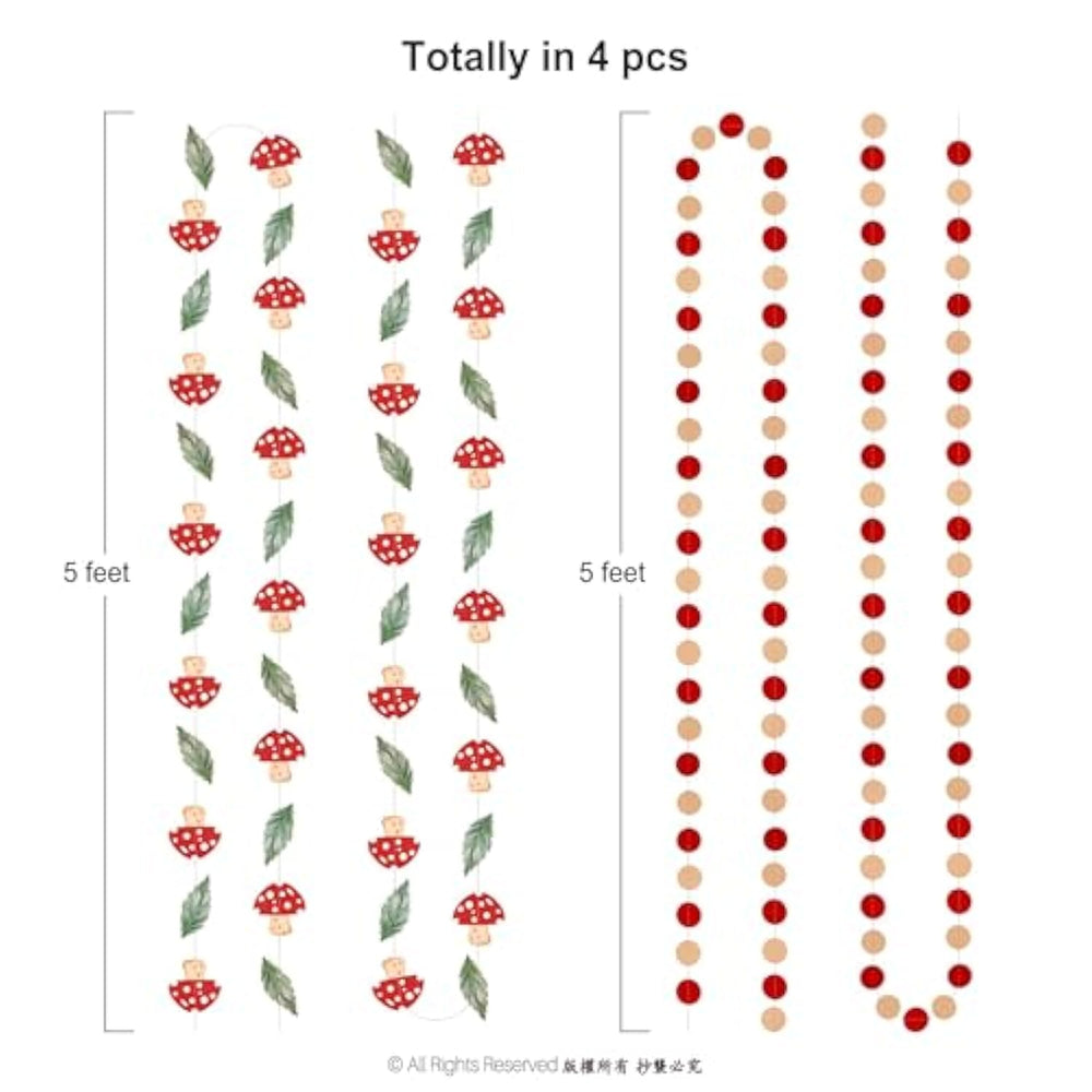 | Package: Set Of Two 5-Ft Mushroom Garland Decorations With Toadstools And Green Leaves, Plus Two Circle Dotted Red And Beige Mushroom Theme Streamers. Great For Mushroom Party Decor, Mushroom Birthday Decorations, Woodland Fairy Parties, And Mushroom Baby Shower Decorations. | | Exclusivity: Our Handcrafted-Style Mushroom Party Garland Decorations Add Charm And Detail. Ideal For Woodland Mushroom Baby Shower Decorations, Fairytale Themed Party Decoration, And Whimsical Mushroom Decorations For Party Settings. | | Versatile Themed Decor: Perfect For Mushroom Birthday Party Decorations, Garden Party Decorations, Weddings, Showers, Or Mushroom Party Decor For Adults. Use As Home Hanging Mushroom Garland Or For Mushroom Themed Party Decorations Indoors Or Out. | | Guideline: Ready To Use—No Diy Needed! Drape These Hanging Mushroom Decorations Over Walls, Ceilings, Toddlers Room Decor Or Trees For Mushroom Party Streamers Or Woodland Fairy Theme Party Decorations. | | Durable And Eye-Catching: Made From Durable Materials, These Woodland Mushroom Decorations Stay Vibrant And Sturdy For Multiple Events. A Must-Have For Mushroom Party Decorations And Your Go-To Mushroom Decor Party Kit. | |