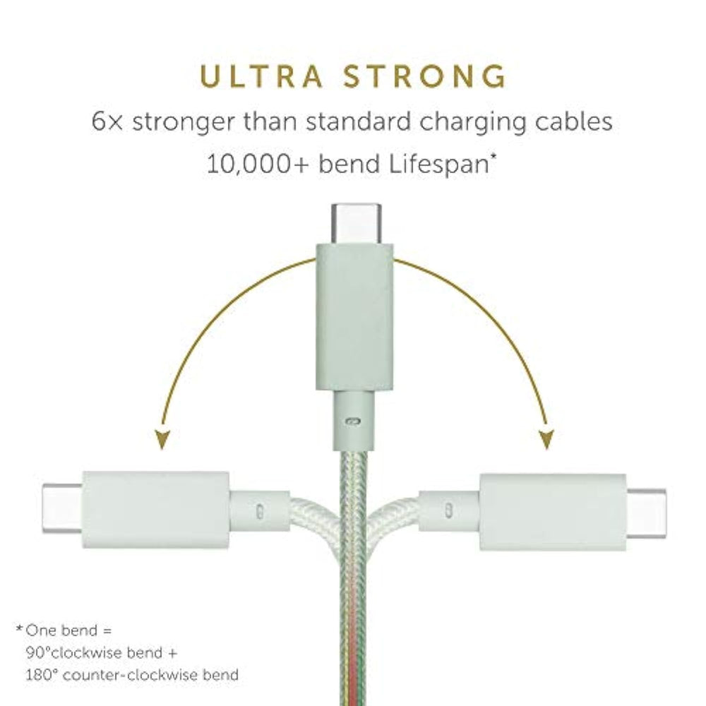 | MADE FOR USB-C DEVICES: Charge sync your most powerful Type-C devices from any USB-C port. Compatible with iPhone Air, 17, 17 Pro, 17 Pro Max, iPhone 16, 16 Plus, 16 Pro, 16 Pro Max, iPhone 15, 15 Plus, 15 Pro, 15 Pro Max, MacBook Pro 14" M4, MacBook Pro 16" M4, MacBook Air 13" M3, MacBook Air 15" M3, MacBook 2017-2023, iPad Pro (2018 and later), iPad Air 4 (2020), iPad Air 5 (2022), iPad mini 6; Galaxy S25/ S25+/ S25 Ultra; Galaxy Z Flip 7/ Fold 7; Google Pixel 10 / 10 Pro / 10 Pro XL; Microsoft Surface Pro 11, Surface Go 4 and more | | HIGH-SPEED FAST CHARGING: Supports Power Delivery (PD) up to 100W for powerful, high-speed charging for your Type-C laptop or tablet. Simply pair with a PD enabled wall-charger to unlock the fastest charge yet | | CLEVER DESIGN: Crafted with an adjustable anchor weight that keeps your cable right where you need it. A built-in LED light easily lets you know when your device is charging. | | ULTRA-STRONG: Durable nylon braided cable featuring a reinforced structure crafted with DuPont Kevlar fiber for unparalleled strength. O-Flex strain relief design at connector joint absorbs 2x more stress than regular strain relief. Its 10,000+ bend* lifespan makes it 6x stronger than standard charging cables | | LIMITED : The Limited will cover any defect in materials or workmanship under normal use conditions, for as long as the