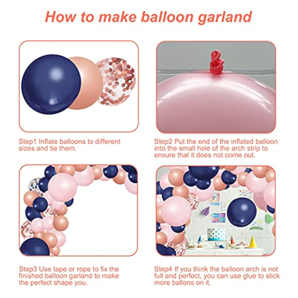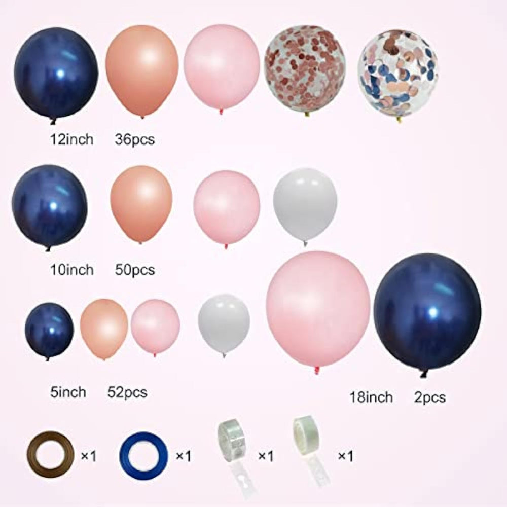 This navy blue and pink balloon set includes a mix of navy, rose gold, pink, and confetti balloons, along with balloon tape, ribbons, and glue for easy setup. Made from durable latex, the balloons can be filled with air, helium, or water. Perfect for gender reveals, showers, birthdays, graduations, and other celebrations, the garland is simple to assemble—just insert balloons into the strip and hang as a backdrop. Note: Avoid overfilling or exposing to heat; colors may vary slightly before and after inflation.