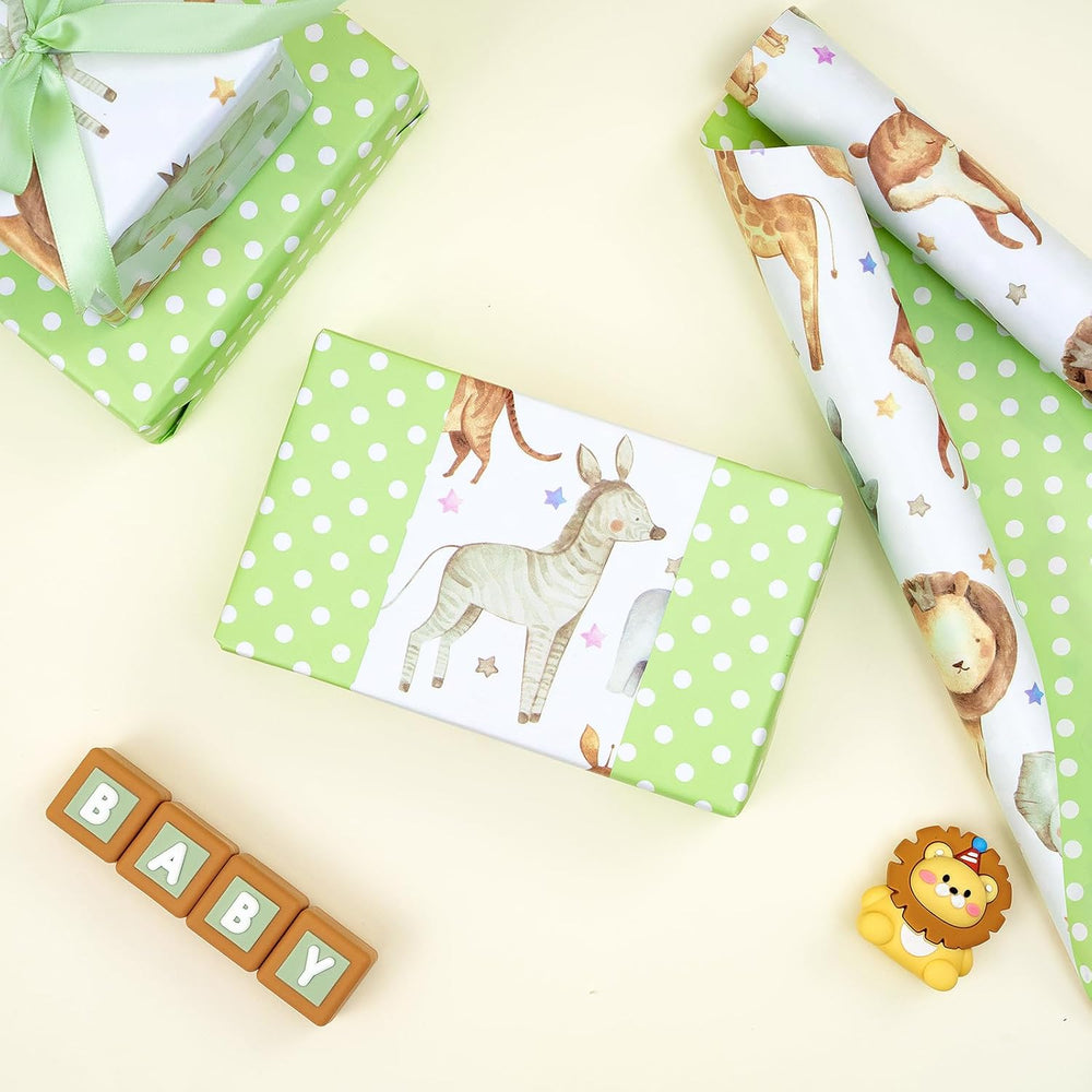 | Adorable Reversible Design: Features Hand-Painted Jungle Animals Including Lions, Elephants And Giraffes With Star Accents On One Side, And A Fresh Green Polka Dot Pattern On The Reverse, Giving You Two Charming Styles In One Roll For Versatile Gift Wrapping Easy To Store: The 17 Inches Wide By 9.8 Feet Long Is Designed For Convenience. The Compact Size Suitable For Small And Medium Gift Wrapping Paper, While Being Easy To Store Among Your Craft Supplies High-Quality Paper: Crafted With Durable Paper, This Gift Wrap Offers Excellent Strength And Reliability. Tear-Resistant And Durable, It Ensures Your Gifts Stay Beautifully Wrapped Without Ripping Or Wrinkling Practical Wrapping Solution: Crafted From Durable, Responsibly Sourced Materials, Our Wrapping Paper Is Designed With Minimal Waste In Roll Packaging And A Natural Look. Its Sturdy Design Allows For Multiple Uses, Offering A Stylish And Eco-Conscious Choice Perfect For Baby Celebrations: Ideal For Baby Showers, Gender Reveal Parties, First Birthdays And Nursery Gifts, Adding A Soft And Charming Touch To Every Special Moment